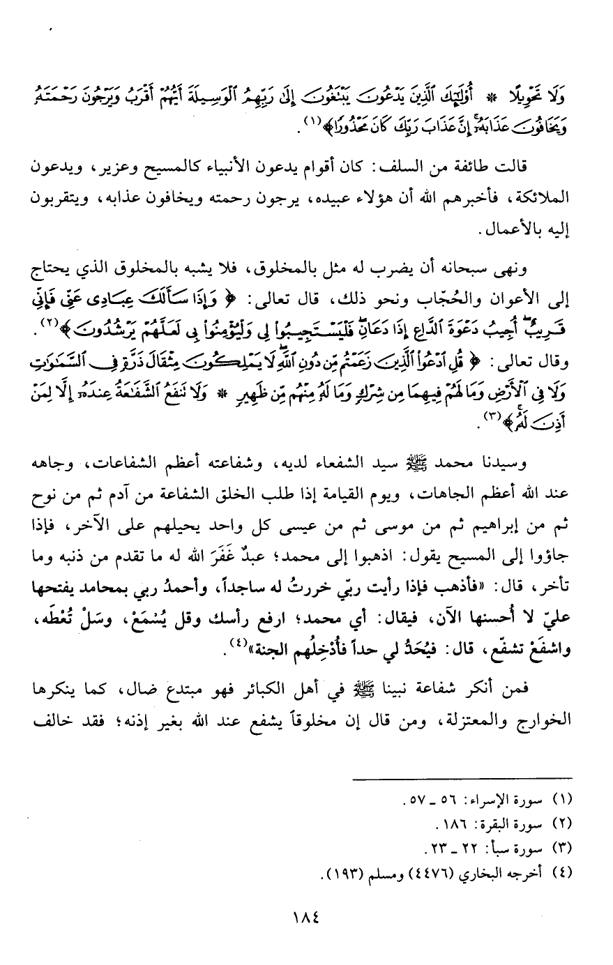 ونهى سبحانه أن يضرب له مثل بالمخلوق، فلا يشبه بالمخلوق الذي يحتاج إلى الأعوان والحُجّاب ونحو ذلك، قال تعالى: {وَإِذَا سَأَلَكَ عِبَادِي عَنِّي فَإِنِّي قَرِيبٌ أُجِيبُ دَعْوَةَ الدَّاعِ إِذَا دَعَانِ فَلْيَسْتَجِيبُوا لِي وَلْيُؤْمِنُوا بِي لَعَلَّهُمْ يَرْشُدُونَ} 2. وقال تعالى: {قُلِ ادْعُوا الَّذِينَ زَعَمْتُمْ مِنْ دُونِ اللَّهِ لا يَمْلِكُونَ مِثْقَالَ ذَرَّةٍ فِي السَّمَاوَاتِ وَلا فِي الْأَرْضِ وَمَا لَهُمْ فِيهِمَا مِنْ شِرْكٍ وَمَا لَهُ مِنْهُمْ مِنْ ظَهِيرٍ * وَلا تَنْفَعُ الشَّفَاعَةُ عِنْدَهُ إِلَّا لِمَنْ أَذِنَ لَهُ} 3.
