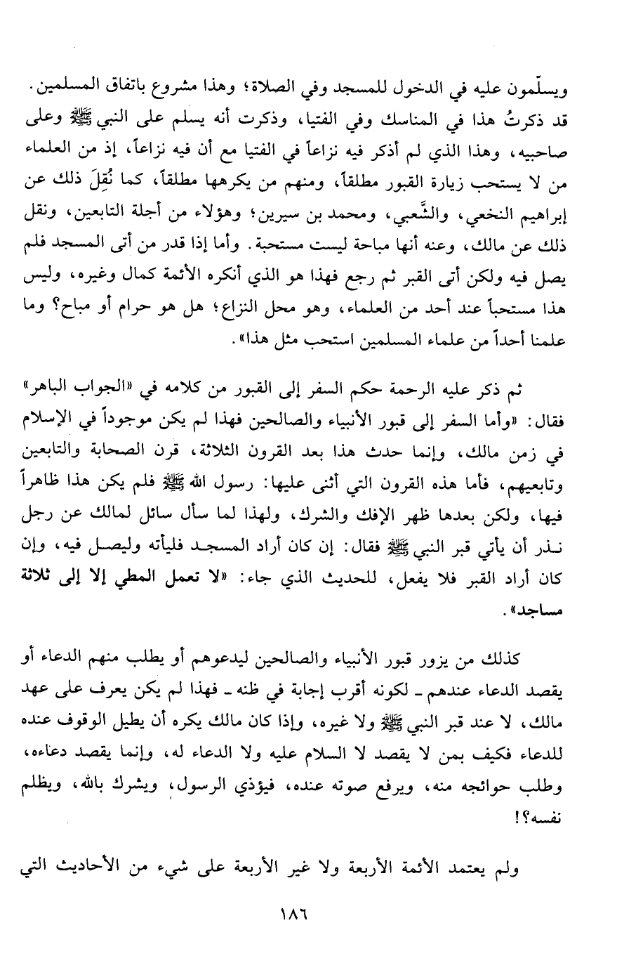 ثم ذكر عليه الرحمة حكم السفر إلى القبور من كلامه في "الجواب الباهر" فقال: "وأما السفر إلى قبور الأنبياء والصالحين فهذا لم يكن موجوداً في الإسلام في زمن مالك، وإنما حدث هذا بعد القرون الثلاثة، قرن الصحابة والتابعين وتابعيهم، فأما هذه القرون التي أثنى عليها: رسول الله صلى الله عليه وسلم فلم يكن هذا ظاهراً فيها، ولكن بعدها ظهر الإفك والشرك، ولهذا لما سأل سائل لمالك عن رجل نذر أن يأتي قبر النبي صلى الله عليه وسلم فقال: إن كان أراد المسجد فليأته وليصل فيه، وإن كان أراد القبر فلا يفعل، للحديث الذي جاء: "لا تعمل المطي إلا إلى ثلاثة مساجد".
