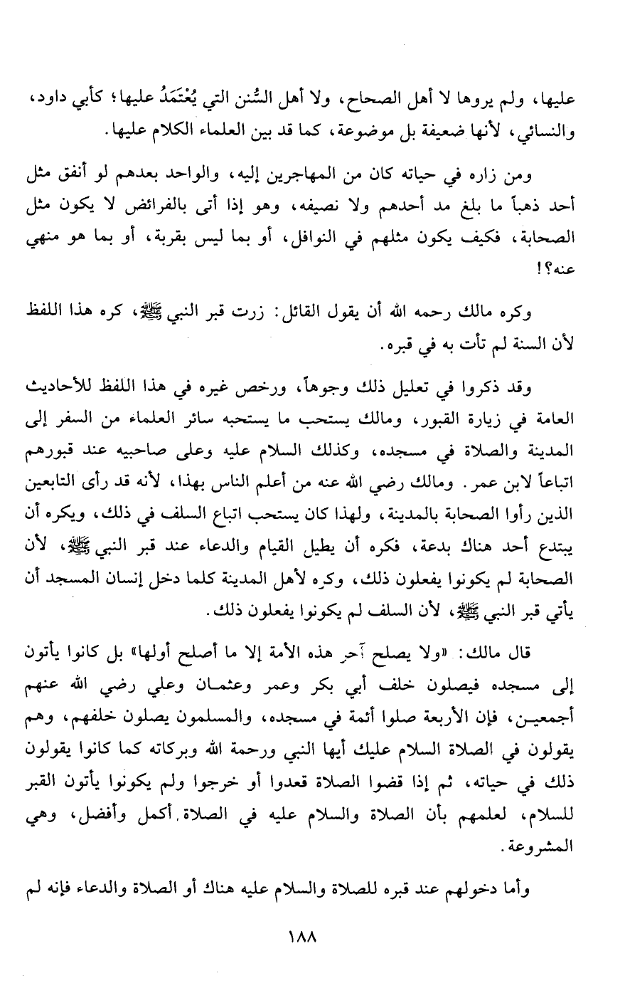 قال مالك: "ولا يصلح آخر هذه الأمة إلا ما أصلح أولها" بل كانوا يأتون إلى مسجده فيصلون خلف أبي بكر وعمر وعثمان وعلي رضي الله عنهم أجمعين، فإن الأربعة صلوا أئمة في مسجده، والمسلمون يصلون خلفهم، وهم يقولون في الصلاة السلام عليك أيها النبي ورحمة الله وبركاته كما كانوا يقولون ذلك في حياته، ثم إذا قضوا الصلاة قعدوا أو خرجوا ولم يكونوا يأتون القبر للسلام، لعلمهم بأن الصلاة والسلام عليه في الصلاة أكمل وأفضل، وهي المشروعة.