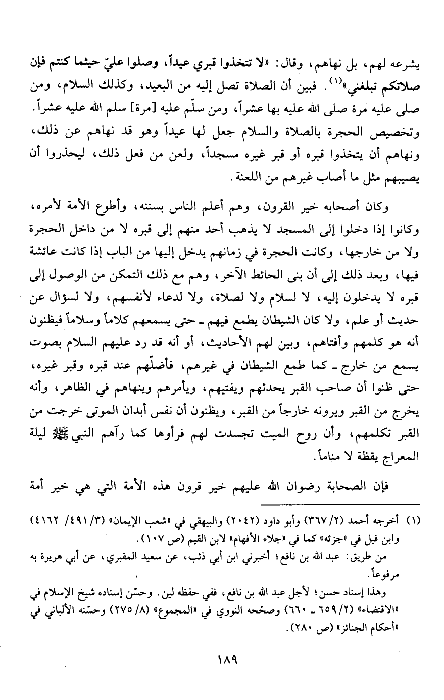 وكان أصحابه خير القرون، وهم أعلم الناس بسننه، وأطوع الأمة لأمره، وكانوا إذا دخلوا إلى المسجد لا يذهب أحد منهم إلى قبره لا من داخل الحجرة ولا من خارجها، وكانت الحجرة في زمانهم يدخل إليها من الباب إذا كانت عائشة فيها، وبعد ذلك إلى أن بنى الحائط الآخر، وهم مع ذلك التمكن من الوصول إلى قبره لا يدخلون إليه، لا لسلام ولا لصلاة، ولا لدعاء لأنفسهم، ولا لسؤال عن حديث أو علم، ولا كان الشيطان يطمع فيهم- حتى يسمعهم كلاماً وسلاماً فيظنون أنه هو كلمهم وأفتاهم، وبين لهم الأحاديث، أو أنه قد رد عليهم السلام بصوت يسمع من خارج- كما طمع الشيطان في غيرهم، فأضلّهم عند قبره وقبر غيره، حتى ظنوا أن صاحب القبر يحدثهم ويفتيهم، ويأمرهم وينهاهم في الظاهر، وأنه يخرج من القبر ويرونه خارجاً من القبر، ويظنون أن نفس أبداًن الموتى خرجت من القبر تكلمهم، وأن روح الميت تجسدت لهم فرأوها كما رآهم النبي صلى الله عليه وسلم ليلة المعراج يقظة لا مناماً.