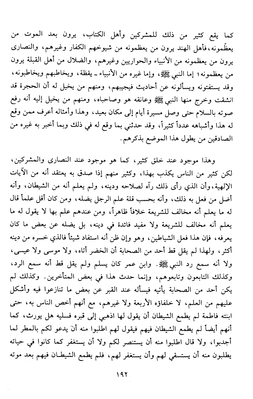 كما يقع كثير من ذلك للمشركين وأهل الكتاب، يرون بعد الموت من يعظّمونه، فأهل الهند يرون من يعظمونه من شيوخهم الكفار وغيرهم، والنصارى يرون من يعظمونه من الأنبياء والحواريين وغيرهم، والضلال من أهل القبلة يرون من يعظمونه؛ إما النبي صلى الله عليه وسلم، وإما غيره من الأنبياء- يقظة، ويخاطبهم ويخاطبونه، وقد يستفتونه ويسألونه عن أحاديث فيجيبهم، ومنهم من يخيل له أن الحجرة قد انشقت وخرج منها النبي صلى الله عليه وسلم وعانقه هو وصاحباه، ومنهم من يخيل إليه أنه رفع صوته بالسلام حتى وصل مسيرة أيام إلى مكان بعيد، وهذا وأمثاله أعرف ممن وقع له هذا وأشباهه عدداً كثيراً، وقد حدثني بما وقع له في ذلك وبما أخبر به غيره من الصادقين من يطول هذا الموضع بذكرهم.