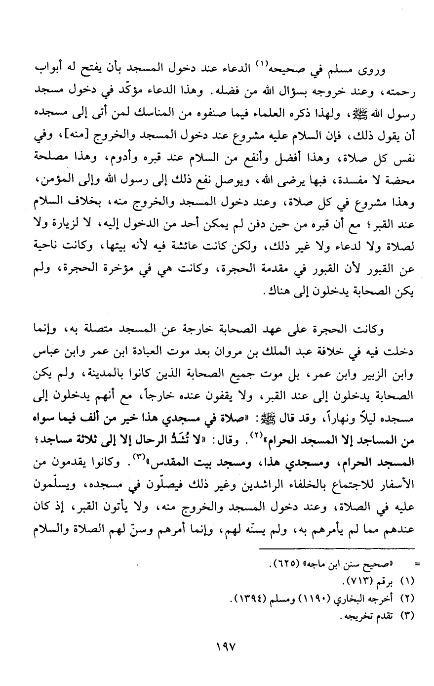 وروى مسلم في صحيحه1 الدعاء عند دخول المسجد بأن يفتح له أبواب رحمته، وعند خروجه بسؤال الله من فضله. وهذا الدعاء مؤكد في دخول مسجد رسول الله صلى الله عليه وسلم، ولهذا ذكره العلماء فيما صنفوه من المناسك لمن أتى إلى مسجده أن يقول ذلك، فإن السلام عليه مشروع عند دخول المسجد والخروج [منه] ، وفي نفس كل صلاة، وهذا أفضل وأنفع من السلام عند قبره وأدوم، وهذا مصلحة محضة لا مفسدة، فبها يرضى الله، ويوصل نفع ذلك إلى رسول الله وإلى المؤمن، وهذا مشروع في كل صلاة، وعند دخول المسجد والخروج منه، بخلاف السلام عند القبر؛ مع أن قبره من حين دفن لم يمكن أحد من الدخول إليه، لا لزيارة ولا لصلاة ولا لدعاء ولا غير ذلك، ولكن كانت عائشة فيه لأنه بيتها، وكانت ناحية عن القبور لأن القبور في مقدمة الحجرة، وكانت هي في مؤخرة الحجرة، ولم يكن الصحابة يدخلون إلى هناك.