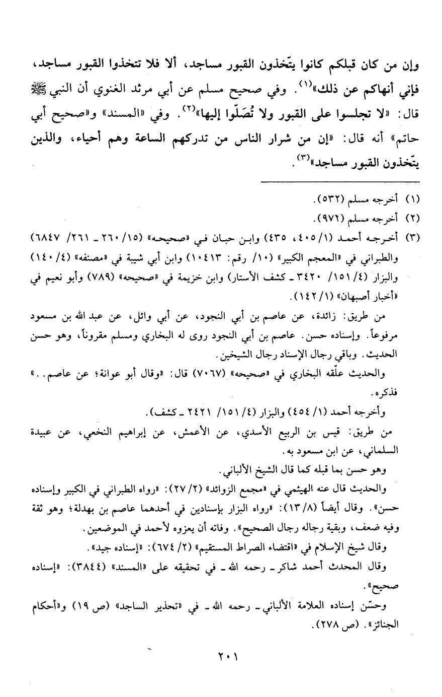 وإن من كان قبلكم كانوا يتّخذون القبور مساجد، ألا فلا تتخذوا القبور مساجد، فإني أنهاكم عن ذلك"1. وفي صحيح مسلم عن أبي مرثد الغنوي أن النبي صلى الله عليه وسلم قال: "لا تجلسوا على القبور ولا تُصَلّوا إليها" 2. وفي "المسند" و"صحيح أبي حاتم" أنه قال: "إن من شرار الناس من تدركهم الساعة وهم أحياء، والذين يتّخذون القبور مساجد"3.