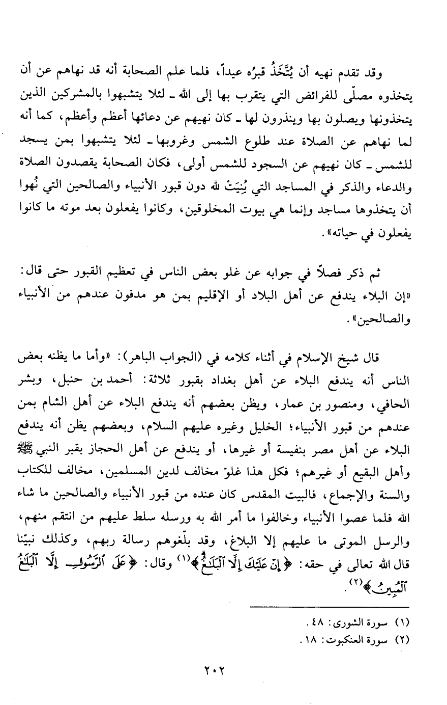 قال شيخ الإسلام في أثناء كلامه في (الجواب الباهر) : "وأما ما يظنه بعض الناس أنه يندفع البلاء عن أهل بغداد بقبور ثلاثة: أحمد بن حنبل، وبشر الحافي، ومنصور بن عمار، ويظن بعضهم أنه يندفع البلاء عن أهل الشام بمن عندهم من قبور الأنبياء؛ الخليل وغيره عليهم السلام، وبعضهم يظن أنه يندفع البلاء عن أهل مصر بنفيسة أو غيرها، أو يندفع عن أهل الحجاز بقبر النبي صلى الله عليه وسلم وأهل البقيع أو غيرهم؛ فكل هذا غلوّ مخالف لدين المسلمين، مخالف للكتاب والسنة والإجماع، فالبيت المقدس كان عنده من قبور الأنبياء والصالحين ما شاء الله فلما عصوا الأنبياء وخالفوا ما أمر الله به ورسله سلط عليهم من انتقم منهم، والرسل الموتى ما عليهم إلا البلاغ، وقد بلّغوهم رسالة ربهم، وكذلك نبيّنا قال الله تعالى في حقه: {إِنْ عَلَيْكَ إِلَّا الْبَلاغُ} 1 وقال: {عَلَى الرَّسُولِ إِلَّا الْبَلاغُ الْمُبِينُ} 2.