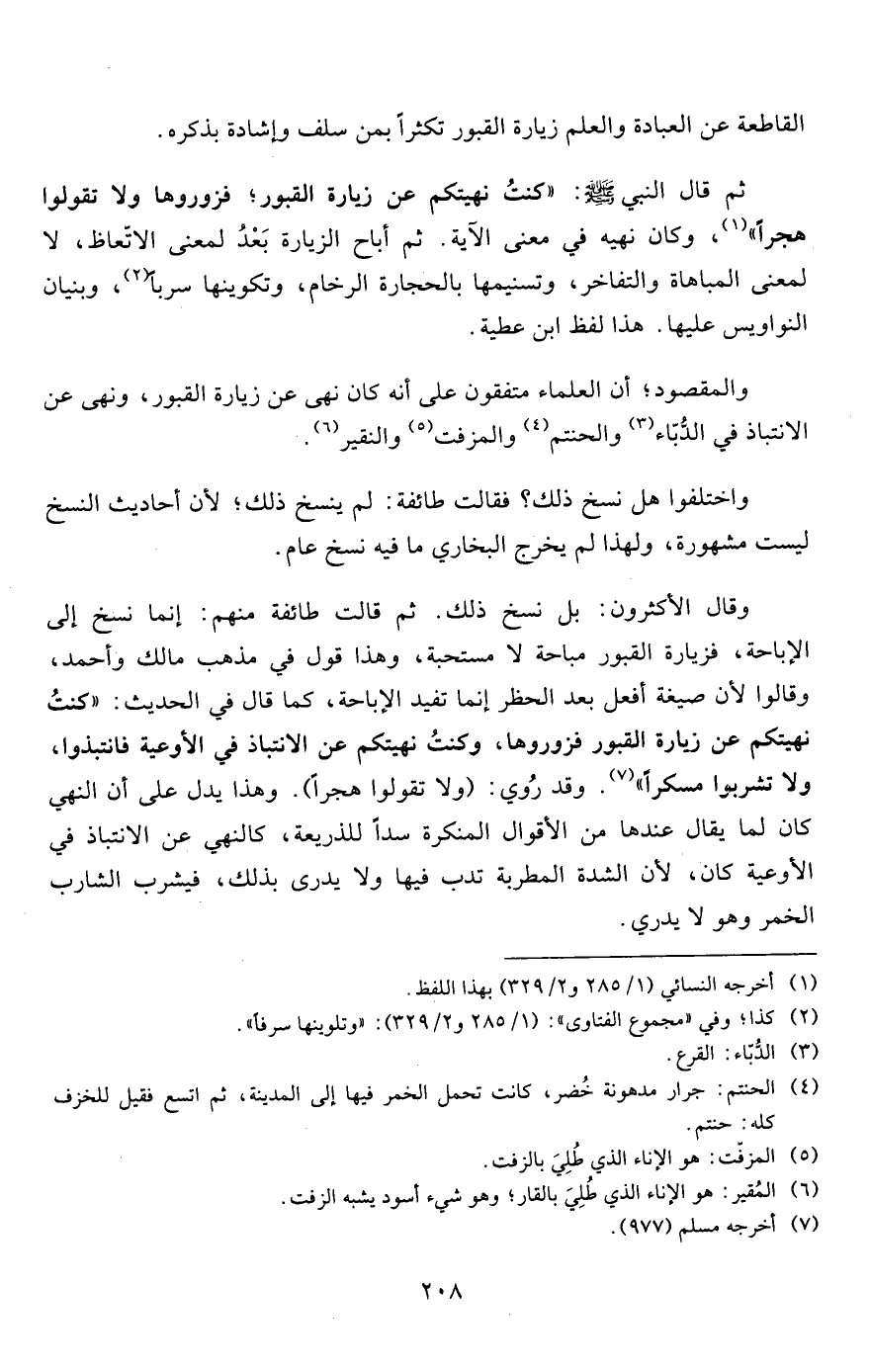 والمقصود؛ أن العلماء متفقون على أنه كان نهى عن زيارة القبور، ونهى عن الانتباذ في الدُّبّاء3 والحنتم4 والمزفت5 والنقير6.