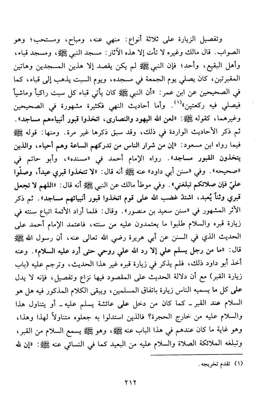 وتفصيل الزيارة على ثلاثة أنواع: منهي عنه، ومباح، ومستحب؛ وهو الصواب. قال مالك وغيره لا تأت إلا هذه الآثار: مسجد النبي صلى الله عليه وسلم، ومسجد قباء، وأهل البقيع، وأحد؛ فإن النبي صلى الله عليه وسلم لم يكن يقصد إلا هذين المسجدين وهاتين المقبرتين، كان يصلي يوم الجمعة في مسجده، ويوم السبت يذهب إلى قباء، كما في الصحيحين عن ابن عمر: "أن النبي صلى الله عليه وسلم كان يأتي قباء كل سبت راكباً وماشياً فيصلي فيه ركعتين"1. وأما أحاديث النهي فكثيرة مشهورة في الصحيحين وغيرهما، كقوله صلى الله عليه وسلم: "لعن الله اليهود والنصارى، اتخذوا قبور أنبياءهم مساجد". ثم ذكر الأحاديث الواردة في ذلك، وقد سبق ذكرها غير مرة. ومنها: قوله صلى الله عليه وسلم فيما رواه ابن مسعود: "إن من شرار الناس من تدركهم الساعة وهم أحياء، والذين يتخذون القبور مساجد". رواه الإمام أحمد في "مسنده"، وأبو حاتم في "صحيحه". وفي "سنن أبي داود" عنه صلى الله عليه وسلم أنه قال: "لا تتخذوا قبري عيداً، وصلّوا عليّ فإن صلاتكم تبلغني". وفي موطأ مالك عن النبي صلى الله عليه وسلم أنه قال: "اللهم لا تجعل قبري وثناً يعبد، اشتد غضب الله على قوم اتخذوا قبور أنبيائهم مساجد". ثم ذكر الأثر المشهور في "سنن سعيد بن منصور". وقال: فلما أراد الأئمة اتباع سنته في زيارة قبره والسلام طلبوا ما يعتمدون عليه من سنته، فاعتمد الإمام أحمد على الحديث الذي في السنن عن أبي هريرة رضي الله تعالى عنه، أن رسول الله صلى الله عليه وسلم قال: "ما من رجل يسلم علي إلا رد الله علي روحي حتى أرد عليه السلام". وعنه أخذ أبو داود ذلك، فلم يذكر في زيارة قبره غير هذا الحديث، وترجم عليه (باب زيارة القبر) مع أن دلالة الحديث على المقصود فيها نزاع وتفصيل، فإنه لا يدل على كل ما يسميه الناس زيارة باتفاق المسلمين، ويبقى الكلام المذكور فيه هل هو السلام عند القبر- كما كان من دخل على عائشة يسلم عليه- أو يتناول هذا والسلام عليه من خارج الحجرة؟ فالذين استدلوا به جعلوه متناولاً لهذا وهذا، وهو غاية ما كان عندهم في هذا الباب عنه صلى الله عليه وسلم، وهو صلى الله عليه وسلم يسمع السلام من القبر، وتبلغه الملائكة الصلاة والسلام عليه من البعيد كما في النسائي عنه صلى الله عليه وسلم: "إن لله