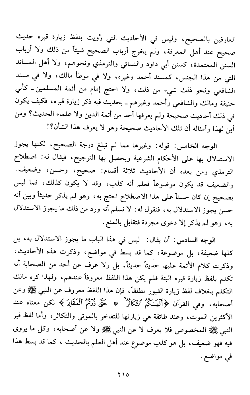 الوجه السادس: أن يقال: ليس في هذا الباب ما يجوز الاستدلال به، بل كلها ضعيفة، بل موضوعة، كما قد بسط في مواضع، وذكرت هذه الأحاديث، وذكرت كلام الأئمة عليها حديثاً حديثاً، بل ولا عرف عن أحد من الصحابة أنه تكلم بلفظ زيارة قبره البتة فلم يكن هذا اللفظ معروفاً عندهم، ولهذا كره مالك التكلم بخلاف لفظ زيارة القبور مطلقاً، فإن هذا اللفظ معروف عن النبي صلى الله عليه وسلم وعن أصحابه، وفي القرآن {أَلْهَاكُمُ التَّكَاثُرُ * حَتَّى زُرْتُمُ الْمَقَابِرَ} لكن معناه عند الأكثرين الموت، وعند طائفة هي زيارتها للتفاخر بالموتى والتكاثر، وأما لفظ قبر النبي صلى الله عليه وسلم المخصوص فلا يعرف لا عن النبي صلى الله عليه وسلم ولا عن أصحابه، وكل ما يروى فيه فهو ضعيف، بل هو كذب موضوع عند أهل العلم بالحديث، كما قد بسط هذا في مواضع.