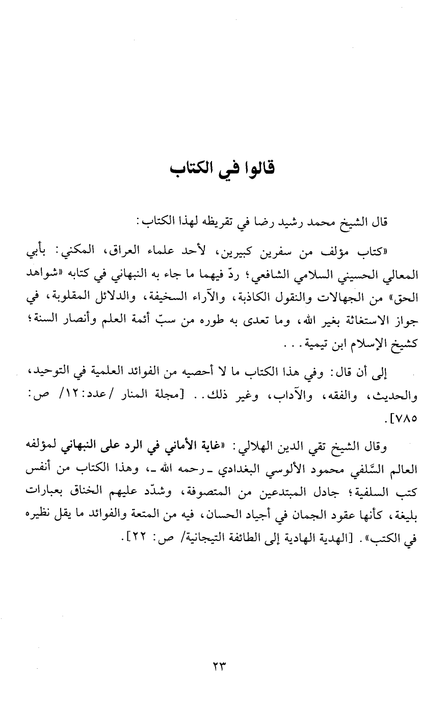 قال الشيخ محمد رشيد رضا في تقريظه لهذا الكتاب: