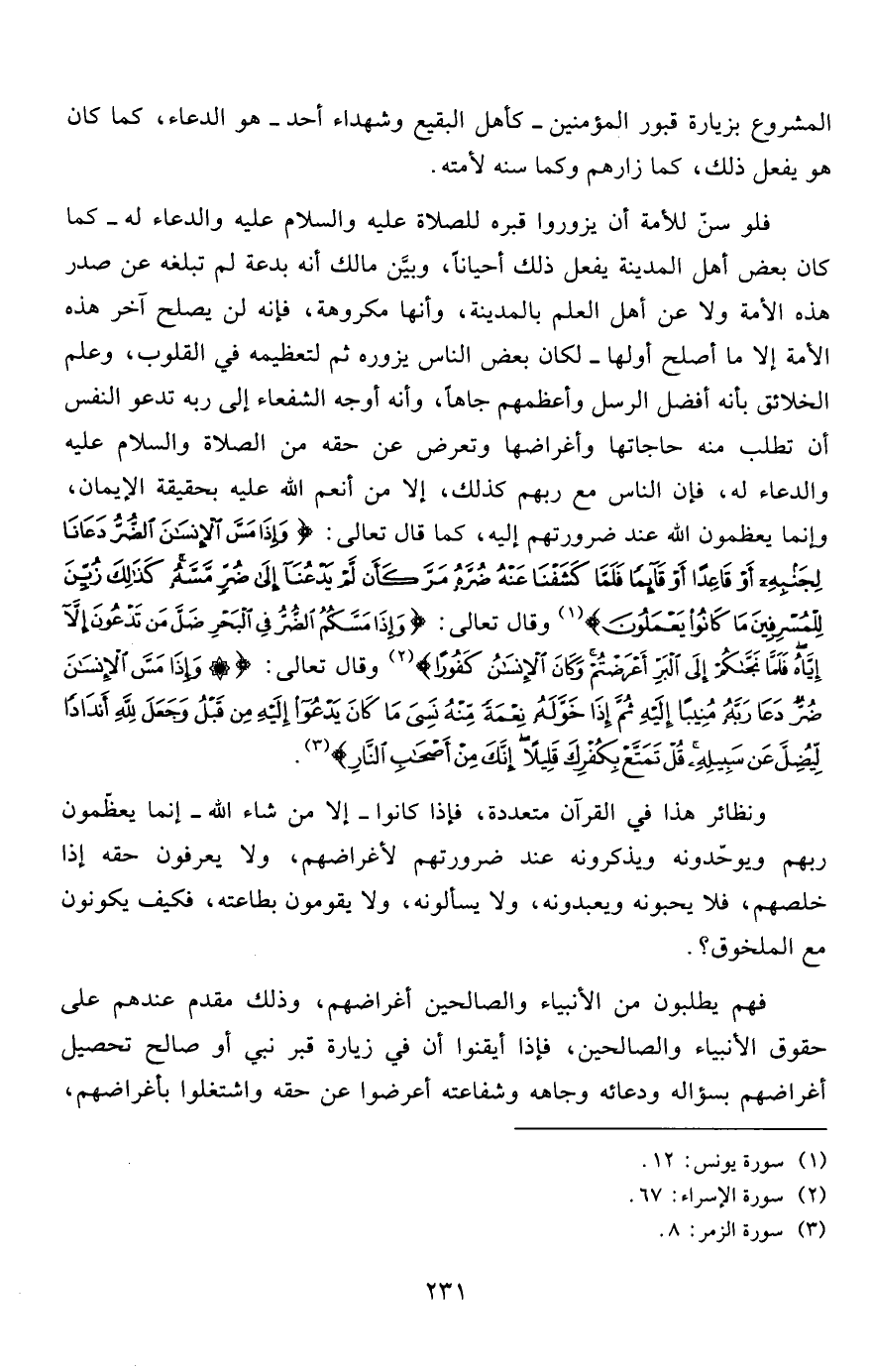 فلو سنّ للأمة أن يزوروا قبره للصلاة عليه والسلام عليه والدعاء له –كما كان بعض أهل المدينة يفعل ذلك أحياناً، وبيِّن مالك أنه بدعة لم تبلغه عن صدر هذه الأمة ولا عن أهل العلم بالمدينة، وأنها مكروهة، فإنه لن يصلح آخر هذه الأمة إلا ما أصلح أولها- لكان بعض الناس يزوره ثم لتعظيمه في القلوب، وعلم الخلائق بأنه أفضل الرسل وأعظمهم جاهاً، وأنه أوجه الشفعاء إلى ربه تدعو النفس أن تطلب منه حاجاتها وأغراضها وتعرض عن حقه من الصلاة والسلام عليه والدعاء له، فإن الناس مع ربهم كذلك، إلا من أنعم الله عليه بحقيقة الإيمان، وإنما يعظمون الله عند ضرورتهم إليه، كما قال تعالى: {وَإِذَا مَسَّ الْأِنْسَانَ الضُّرُّ دَعَانَا لِجَنْبِهِ أَوْ قَاعِداً أَوْ قَائِماً فَلَمَّا كَشَفْنَا عَنْهُ ضُرَّهُ مَرَّ كَأَنْ لَمْ يَدْعُنَا إِلَى ضُرٍّ مَسَّهُ كَذَلِكَ زُيِّنَ لِلْمُسْرِفِينَ مَا كَانُوا يَعْمَلُونَ} 1 وقال تعا لى: {وَإِذَا مَسَّكُمُ الضُّرُّ فِي الْبَحْرِ ضَلَّ مَنْ تَدْعُونَ إِلَّا إِيَّاهُ فَلَمَّا نَجَّاكُمْ إِلَى الْبَرِّ أَعْرَضْتُمْ وَكَانَ الْأِنْسَانُ كَفُوراً} 2 وقال تعالى: {وَإِذَا مَسَّ الْأِنْسَانَ ضُرٌّ دَعَا رَبَّهُ مُنِيباً إِلَيْهِ ثُمَّ إِذَا خَوَّلَهُ نِعْمَةً مِنْهُ نَسِيَ مَا كَانَ يَدْعُو إِلَيْهِ مِنْ قَبْلُ وَجَعَلَ لِلَّهِ أَنْدَاداً لِيُضِلَّ عَنْ سَبِيلِهِ قُلْ تَمَتَّعْ بِكُفْرِكَ قَلِيلاً إِنَّكَ مِنْ أَصْحَابِ النَّارِ} 3.