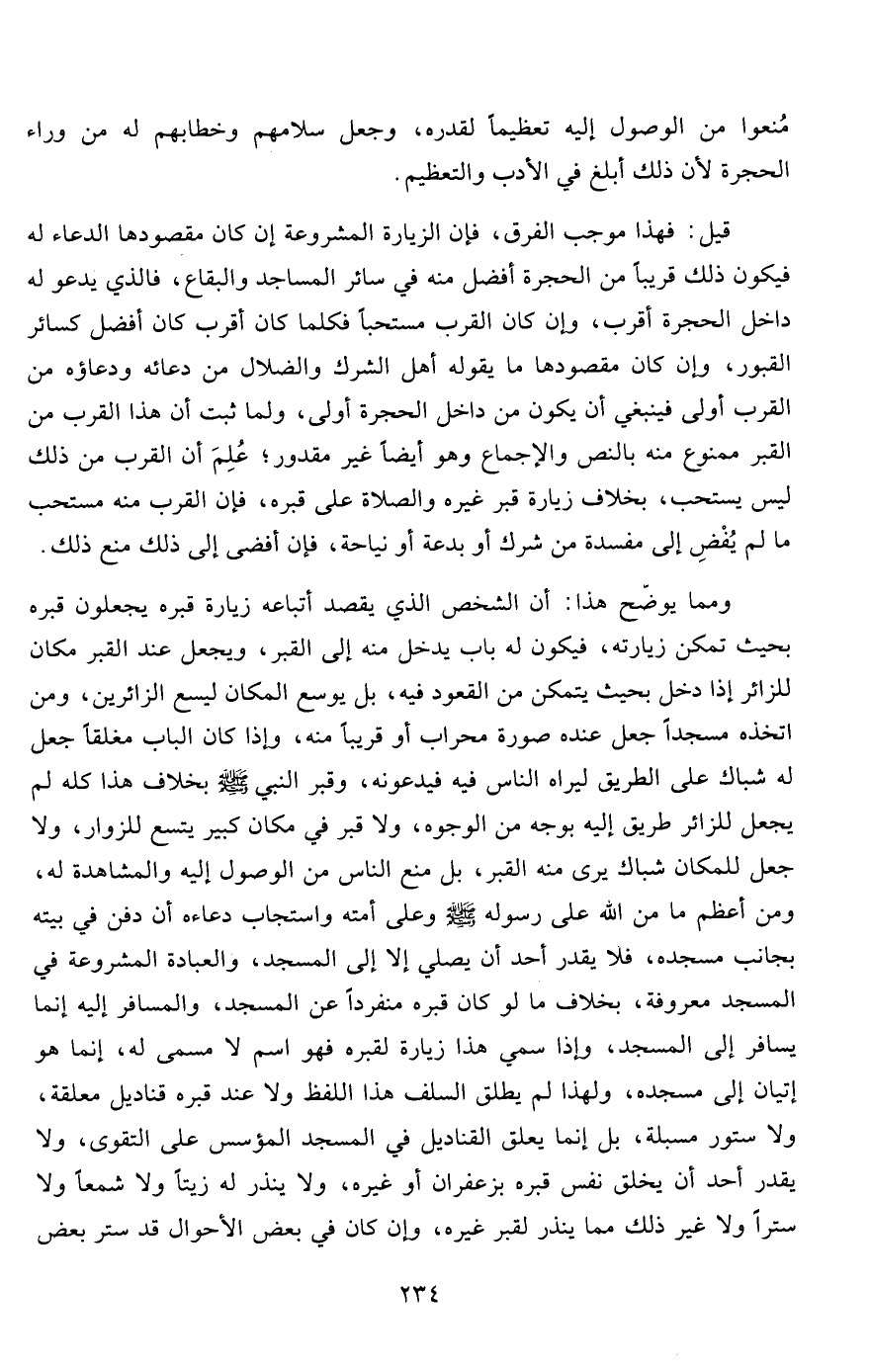 ومما يوضّح هذا: أن الشخص الذي يقصد أتباعه زيارة قبره يجعلون قبره بحيث تمكن زيارته، فيكون له باب يدخل منه إلى القبر، ويجعل عند القبر مكان للزائر إذا دخل بحيث يتمكن من القعود فيه، بل يوسع المكان ليسع الزائرين، ومن اتخذه مسجداً جعل عنده صورة محراب أو قريباً منه، صااذا كان الباب مغلقاً جعل له شباك على الطريق ليراه الناس فيه فيدعونه، وقبر النبي صلى الله عليه وسلم بخلاف هذا كله لم يجعل للزائر طريق إليه بوجه من الوجوه، ولا قبر في مكان كبير يتسع للزوار، ولا جعل للمكان شباك يرى منه القبر، بل منع الناس من الوصول إليه والمشاهدة له، ومن أعظم ما من الله على رسوله صلى الله عليه وسلم وعلى أمته واستجاب دعاءه أن دفن في بيته بجانب مسجده، فلا يقدر أحد أن يصلي إلا إلى المسجد، والعبادة المشروعة في المسجد معروفة، بخلاف ما لو كان قبره منفرداً عن المسجد، والمسافر إليه إنما يسافر إلى المسجد، وإذا سمي هذا زيارة لقبره فهو اسم لا مسمى له، إنما هو إتيان إلى مسجده، ولهذا لم يطلق السلف هذا اللفظ ولا عند قبره قناديل معلقة، ولا ستور مسبلة، بل إنما يعلق القناديل في المسجد المؤسس على التقوى، ولا يقدر أحد أن يخلق نفس قبره بزعفران أو غيره، ولا ينذر له زيتاً ولا شمعاً ولا ستراً ولا غير ذلك مما ينذر لقبر غيره، وإن كان في بعض الأحوال قد ستر بعض