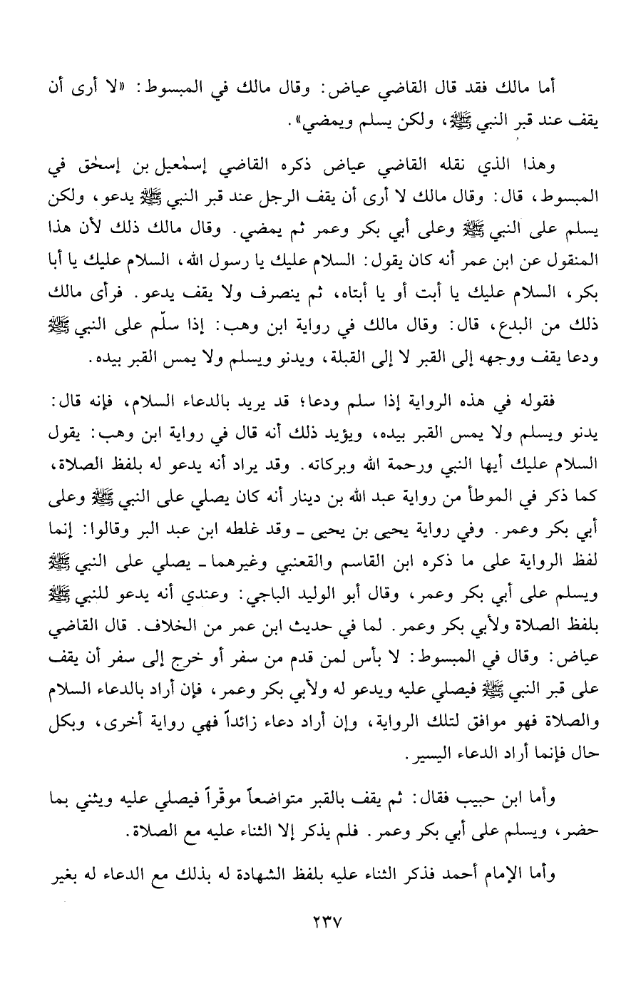 وهذا الذي نقله القاضي عياض ذكره القاضي إسماعيل بن إسحاق في المبسوط، قال: وقال مالك لا أرى أن يقف الرجل عند قبر النبي صلى الله عليه وسلم يدعو، ولكن يسلم على النبي صلى الله عليه وسلم وعلى أبي بكر وعمر ثم يمضي. وقال مالك ذلك لأن هذا المنقول عن ابن عمر أنه كان يقول: السلام عليك يا رسول الله، السلام عليك يا أبا بكر، السلام عليك يا أبت أو يا أبتاه، ثم ينصرت ولا يقف يدعو. فرأى مالك ذلك من البدع، قال: وقال مالك في رواية ابن وهب: إذا سلّم على النبي صلى الله عليه وسلم ودعا يقف ووجهه إلى القبر لا إلى القبلة، ويدنو ويسلم ولا يمس القبر بيده.