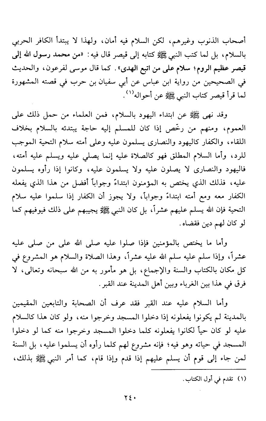 أصحاب الذنوب وغيرهم، لكن السلام فيه أمان، ولهذا لا يبتدأ الكافر الحربي بالسلام، بل لما كتب النبي صلى الله عليه وسلم كتابه إلى قيصر قال فيه: "من محمد رسول الله إلى قيصر عظيم الروم؛ سلام على من اتبع الهدى". كما قال موسى لفرعون، والحديث في الصحيحين من رواية ابن عباس عن أبي سفيان بن حرب في قصته المشهورة لما قرأ قيصر كتاب النبي صلى الله عليه وسلم عن أحواله1.