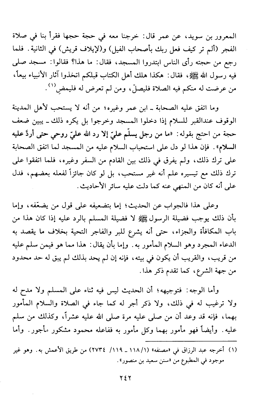 المعرور بن سويد، عن عمر قال: خرجنا معه في حجة حجها فقرأ بنا في صلاة الفجر (ألم تر كيف فعل ربك بأصحاب الفيل) و (لإيلاف قريش) في الثانية. فلما رجع من حجته رأى الناس ابتدروا المسجد، فقال: ما هذا؟ فقالوا: مسجد صلى فيه رسول الله صلى الله عليه وسلم، فقال: هكذا هلك أهل الكتاب قبلكم اتخذوا آثار الأنبياء بيعاً، من عرضت له منكم فيه الصلاة فليصلّ، ومن لم تعرض له فليمضِ1.