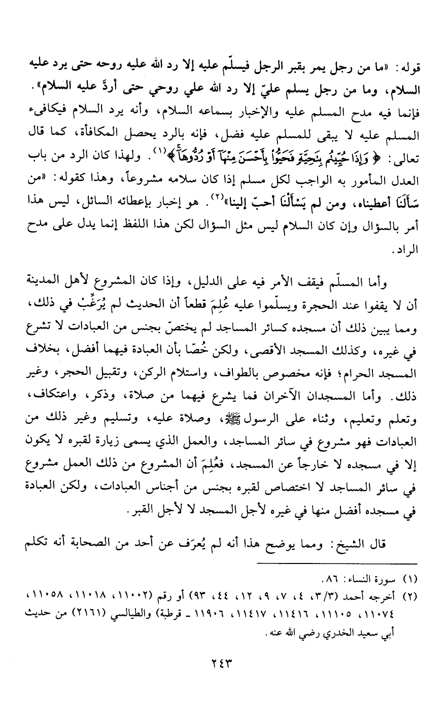 وأما المسلّم فيقف الأمر فيه على الدليل، وإذا كان المشروع لأهل المدينة أن لا يقفوا عند الحجرة ويسلّموا عليه عُلِمَ قطعاً أن الحديث لم يُرَغِّبْ في ذلك، ومما يبين ذلك أن مسجده كسائر المساجد لم يختصّ بجنس من العبادات لا تشرع في غيره، وكذلك المسجد الأقصى، ولكن خُصّا بأن العبادة فيهما أفضل، بخلاف المسجد الحرام، فإنه مخصوص بالطواف، واستلام الركن، وتقبيل الحجر، وغير ذلك. وأما المسجدان الآخران فما يشرع فيهما من صلاة، وذكر، واعتكاف، وتعلم وتعليم، وثناء على الرسول صلى الله عليه وسلم، وصلاة عليه، وتسليم وغير ذلك من العبادات فهو مشروع في سائر المساجد، والعمل الذي يسمى زيارة لقبره لا يكون إلا في مسجده لا خارجاً عن المسجد، فعُلِمَ أن المشروع من ذلك العمل مشروع في سائر المساجد لا اختصاص لقبره بجنس من أجناس العبادات، ولكن العبادة في مسجده أفضل منها في غيره لأجل المسجد لا لأجل لقبر.