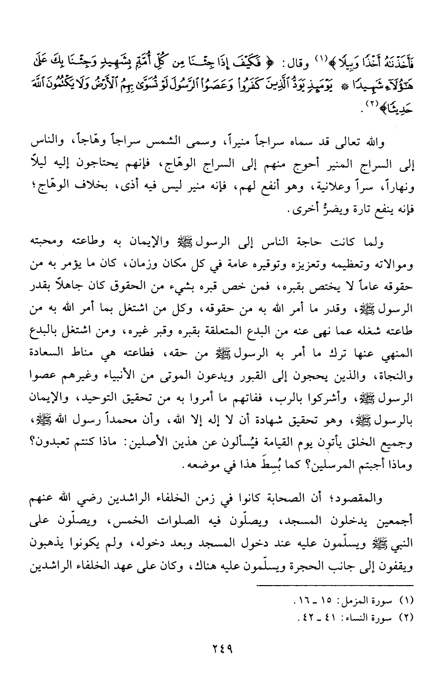 ولما كانت حاجة الناس إلى الرسول صلى الله عليه وسلم والإيمان به وطاعته ومحبته وموالاته وتعظيمه وتعزيزه وتوقيره عامة في كل مكان وزمان، كان ما يؤمر به من حقوقه عاماً لا يختص بقبره، فمن خص قبره بشيء من الحقوق كان جاهلاً بقدر الرسول صلى الله عليه وسلم، وقدر ما أمر الله به من حقوقه، وكل من اشتغل بما أمر الله به من طاعته شغله عما نهى عنه من البدع المتعلقة بقبره وقبر غيره، ومن اشتغل بالبدع المنهي عنها ترك ما أمر به الرسول صلى الله عليه وسلم من حقه، فطاعته هي مناط السعادة والنجاة، والذين يحجون إلى القبور ويدعون الموتى من الأنبياء وغيرهم عصوا الرسول صلى الله عليه وسلم، وأشركوا بالرب، ففاتهم ما أمروا به من تحقيق التوحيد، والإيمان بالرسول صلى الله عليه وسلم، وهو تحقيق شهادة أن لا إله إلا الله، وأن محمداً رسول الله صلى الله عليه وسلم، وجميع الخلق يأتون يوم القيامة فيُسألون عن هذين الأصلين: ماذا كنتم تعبدون؟ وماذا أجبتم المرسلين؟ كما بُسِطَ هذا في موضعه.