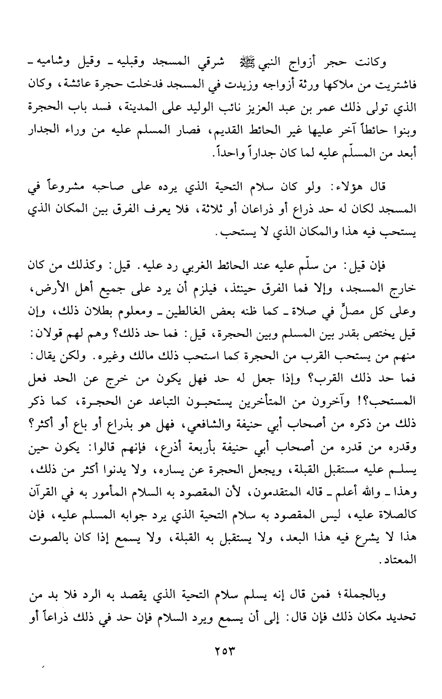 فإن قيل: من سلّم عليه عند الحائط الغربي رد عليه. قيل: وكذلك من كان خارج المسجد، وإلا فما الفرق حينئذ، فيلزم أن يرد على جميع أهل الأرض، وعلى كل مصلٍّ في صلاة- كما ظنه بعض الغالطين- ومعلوم بطلان ذلك، وإن قيل يختص بقدر بين المسلم وبين الحجرة، قيل: فما حد ذلك؟ وهم لهم قولان: منهم من يستحب القرب من الحجرة كما استحب ذلك مالك وغيره. ولكن يقال: فما حد ذلك القرب؟ وإذا جعل له حد فهل يكون من خرج عن الحد فعل المستحب؟! وآخرون من المتأخرين يستحبون التباعد عن الحجرة، كما ذكر ذلك من ذكره من أصحاب أبي حنيفة والشافعي، فهل هو بذراع أو باع أو أكثر؟ وقدره من قدره من أصحاب أبي حنيفة بأربعة أذرع، فإنهم قالوا: يكون حين يسلم عليه مستقبل القبلة، ويجعل الحجرة عن يساره، ولا يدنوا أكثر من ذلك، وهذا- والله أعلم- قاله المتقدمون، لأن المقصود به السلام المأمور به في القرآن كالصلاة عليه، ليس المقصود به سلام التحية الذي يرد جوابه المسلم عليه، فإن هذا لا يشرع فيه هذا البعد، ولا يستقبل به القبلة، ولا يسمع إذا كان بالصوت المعتاد.