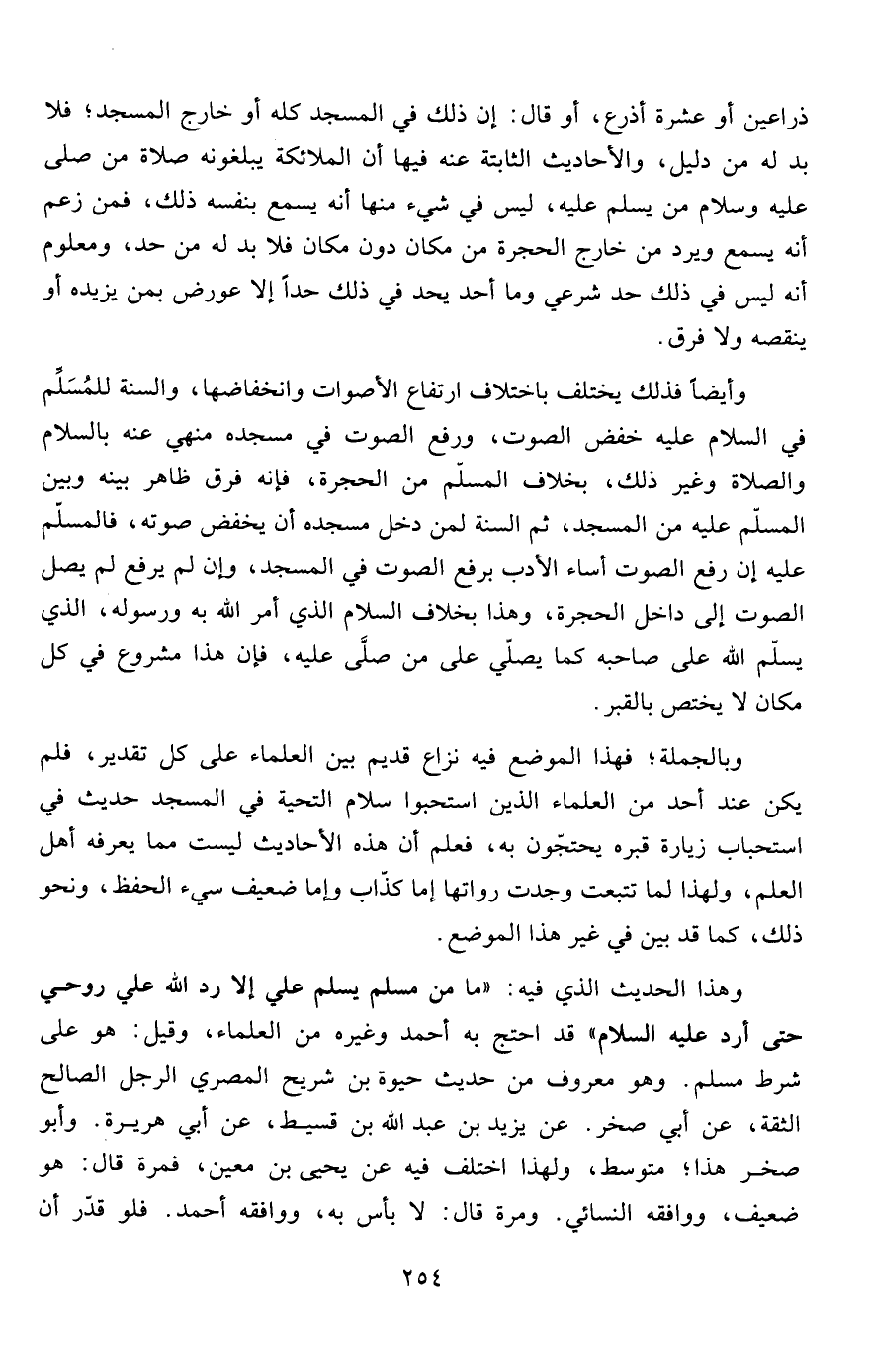 وأيضاً فذلك يختلف باختلاف ارتفاع الأصوات وانخفاضها، والسنة للمُسَلِّم في السلام عليه خفض الصوت، ورفع الصوت في مسجده منهي عنه بالسلام والصلاة وغير ذلك، بخلاف المسلّم من الحجرة، فإنه فرق ظاهر بينه وبين المسلّم عليه من المسجد، ثم السنة لمن دخل مسجده أن يخفض صوته، فالمسلّم عليه إن رفع الصوت أساء الأدب برفع الصوت في المسجد، وإن لم يرفع لم يصل الصوت إلى داخل الحجرة، وهذا بخلاف السلام الذي أمر الله به ورسوله، الذي يسلّم الله على صاحبه كما يصلّي على من صلَّى عليه، فإن هذا مشروع في كل مكان لا يختص بالقبر.