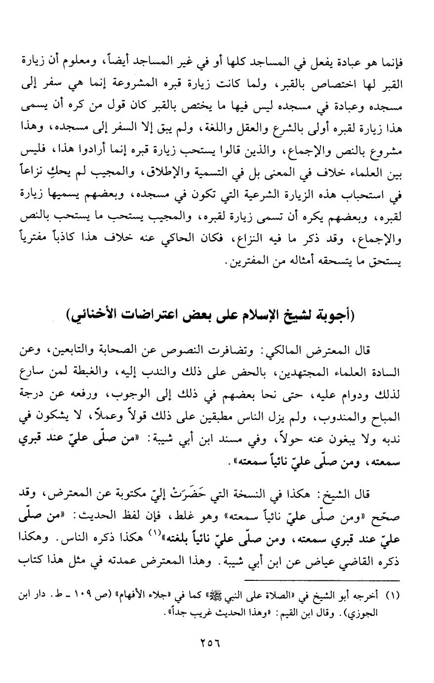 قال المعترض المالكي: وتضافرت النصوص عن الصحابة والتابعين، وعن السادة العلماء المجتهدين، بالحض على ذلك والندب إليه، والغبطة لمن سارع لذلك ودوام عليه، حتى نحا بعضهم في ذلك إلى الوجوب، ورفعه عن درجة المباح والمندوب، ولم يزل الناس مطبقين على ذلك قولاً وعملاً، لا يشكون في ندبه ولا يبغون عنه حولاً، وفي مسند ابن أبي شيبة: "من صلّى عليّ عند قبري سمعته، ومن صلّى عليّ نائياً سمعته".