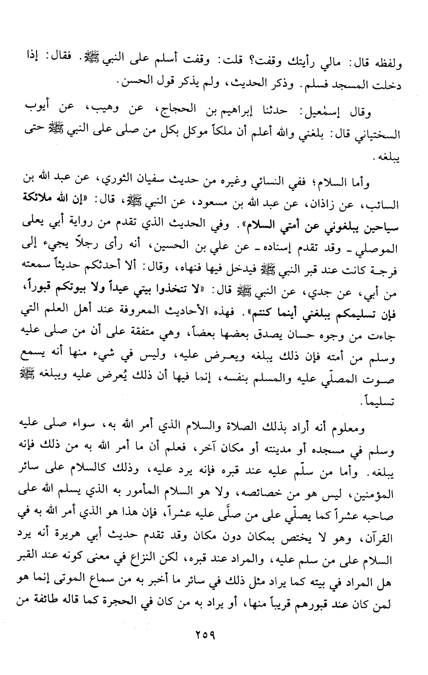 وأما السلام؛ ففي النسائي وغيره من حديث سفيان الثوري، عن عبد الله بن السائب، عن زاذان، عن عبد الله بن مسعود، عن النبي صلى الله عليه وسلم، قال: "إن الله ملائكة سياحين يبلغوني عن أمتي السلام". وفي الحديث الذي تقدم من رواية أبي يعلى الموصلي -وقد تقدم إسناده- عن علي بن الحسين، أنه رأى رجلاً يجيء إلى فرجة كانت عند قبر النبي صلى الله عليه وسلم فيدخل فيها فنهاه، وقال: ألا أحدثكم حديثاً سمعته من أبي، عن جدي، عن النبي صلى الله عليه وسلم قال: "لا تتخذوا بيتي عيداً ولا بيوتكم قبوراً، فإن تسليمكم يبلغني أينما كنتم". فهذه الأحاديث المعروفة عند أهل العلم التي جاءت من وجوه حسان يصدق بعضها بعضاً، وهي متفقة على أن من صلى عليه وسلم من أمته فإن ذلك يبلغه ويعرض عليه، وليس في شيء منها أنه يسمع صوت المصلّي عليه والمسلم بنفسه، إنما فيها أن ذلك يُعرض عليه ويبلغه صلى الله عليه وسلم تسليماً.
