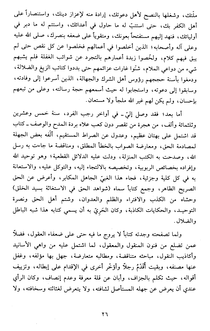 أما بعد؛ فقد وصل إليّ- في أواخر رجب الفرد، سنة خمس وعشرين وثلثمائة وألف، من هجرة من تقصر دون كعب علاه بردة المدح والوصف- كتاب قد اشتمل على بهتان عظيم، وعدول عن الصراط المستقيم، ألّفه بعض الجهلة لمصادمة الحق، ومعارضة الصواب بالخطأ المطلق، ومناقضة ما جاءت به رسل الله، وصدحت به الكتب المنزلة، ودلت عليه الدلائل القطعية؛ وهو توحيد الله وإفراده بخصائص الربوبية، وتخصيصه بالالتجاء إليه، والتوكل عليه، والاستعانة به في كل كلية وجزئية، فجاء هذا الغبيّ الجاهل المكابر، وأعرض عن الحق الصريح الظاهر، وجمع كتاباً سماه (شواهد الحق في الاستغاثة بسيد الخلق) وحشاه من الكذب والافتراء والظلم والعدوان، وشتم أهل الحق ونصرة التوحيد، والحكايات الكاذبة، وكان الحَرِيّ به أن يسمي كتابه هذا شبه الباطل والضلال.