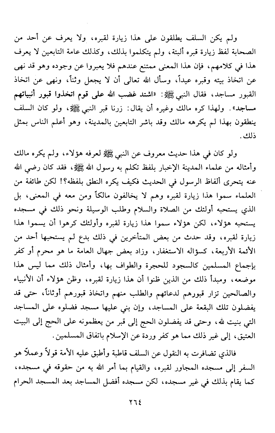 ولم يكن السلف يطلقون على هذا زيارة لقبره، ولا يعرف عن أحد من الصحابة لفظ زيارة قبره ألبتة، ولم يتكلموا بذلك، وكذلك عامة التابعين لا يعرف هذا في كلامهم، فإن هذا المعنى ممتنع عندهم فلا يعبروا عن وجوده وهو قد نهى عن اتخاذ بيته وقبره عيداً، وسأل الله تعالى أن لا يجعل وثناً، ونهى عن اتخاذ القبور مساجد، فقال النبي صلى الله عليه وسلم: "اشتد غضب الله على قوم اتخذوا قبور أنبيائهم مساجد". ولهذا كره مالك وغيره أن يقال: زرنا قبر النبي صلى الله عليه وسلم، ولو كان السلف ينطقون بهذا لم يكرهه مالك وقد باشر التابعين بالمدينة، وهو أعلم الناس بمثل ذلك.