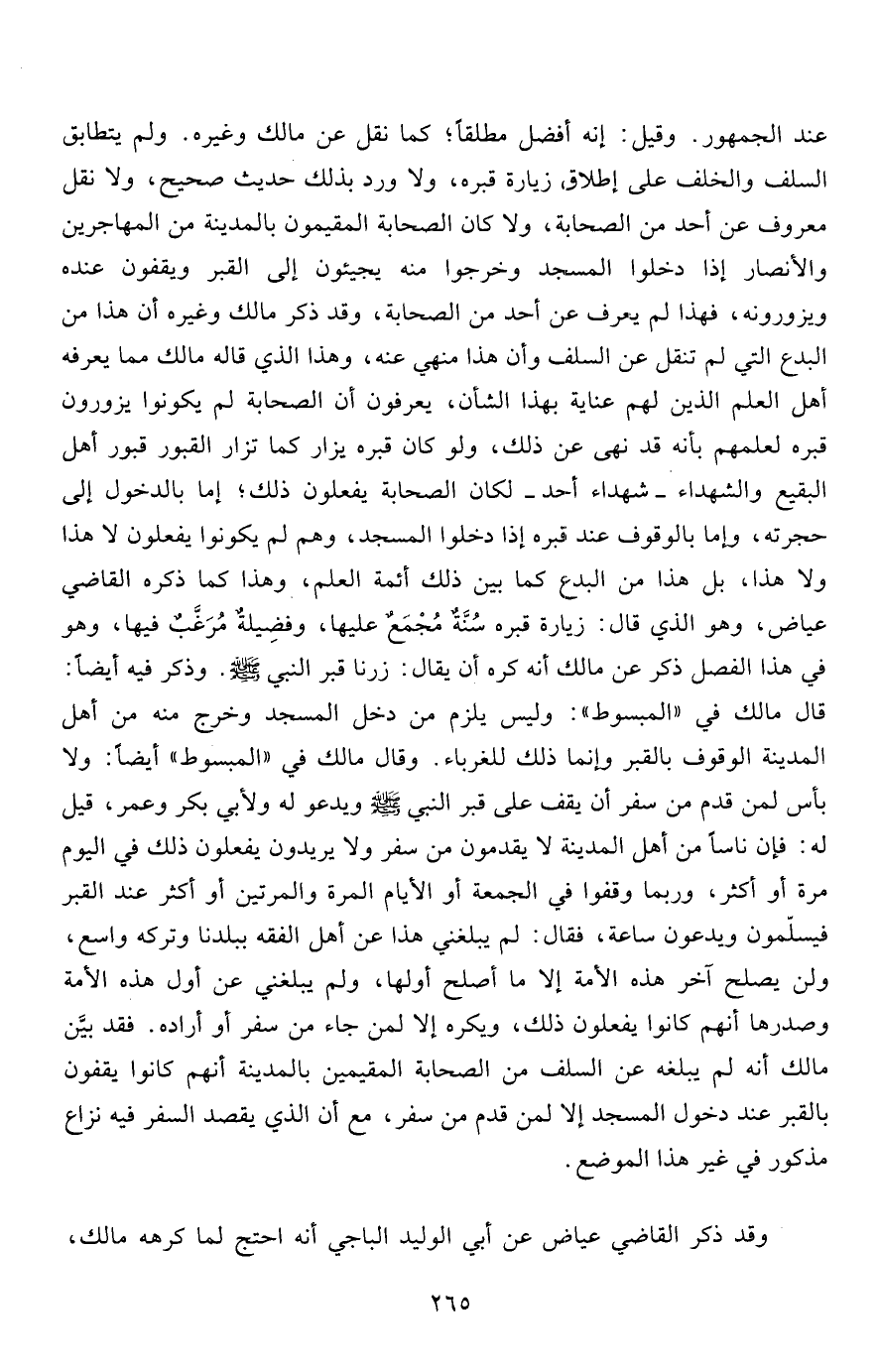 عند الجمهور. وقيل: إنه أفضل مطلقاً؛ كما نقل عن مالك وغيره. ولم يتطابق السلف والخلف على إطلاق زيارة قبره، ولا ورد بذلك حديث صحيح، ولا نقل معروف عن أحد من الصحابة، ولا كان الصحابة المقيمون بالمدينة من المهاجرين والأنصار إذا دخلوا المسجد وخرجوا منه يجيئون إلى القبر ويقفون عنده ويزورونه، فهذا لم يعرف عن أحد من الصحابة، وقد ذكر مالك وغيره أن هذا من البدع التي لم تنقل عن السلف وأن هذا منهي عنه، وهذا الذي قاله مالك مما يعرفه أهل العلم الذين لهم عناية بهذا الشأن، يعرفون أن الصحابة لم يكونوا يزورون قبره لعلمهم بأنه قد نهى عن ذلك، ولو كان قبره يزار كما تزار القبور قبور أهل البقيع والشهداء- شهداء أحد- لكان الصحابة يفعلون ذلك، إما بالدخول إلى حجرته، وإما بالوقوف عند قبره إذا دخلوا المسجد، وهم لم يكونوا يفعلون لا هذا ولا هذا، بل هذا من البدع كما بين ذلك أئمة العلم، وهذا كما ذكره القاضي عياض، وهو الذي قال: زيارة قبره سُنَّةٌ مُجْمَعٌ عليها، وفضِيلةٌ مُرَغَّبٌ فيها، وهو في هذا الفصل ذكر عن مالك أنه كره أن يقال: زرنا قبر النبي صلى الله عليه وسلم. وذكر فيه أيضاً: قال مالك في "المبسوط": وليس يلزم من دخل المسجد وخرج منه من أهل المدينة الوقوف بالقبر وإنما ذلك للغرباء. وقال مالك في "المبسوط" أيضاً: ولا بأس لمن قدم من سفر أن يقف على قبر النبي صلى الله عليه وسلم ويدعو له ولأبي بكر وعمر، قيل له: فإن ناساً من أهل المدينة لا يقدمون من سفر ولا يريدون يفعلون ذلك في اليوم مرة أو أكثر، وربما وقفوا في الجمعة أو الأيام المرة والمرتين أو أكثر عند القبر فيسلّمون ويدعون ساعة، فقال: لم يبلغني هذا عن أهل الفقه ببلدنا وتركه واسع، ولن يصلح آخر هذه الأمة إلا ما أصلح أولها، ولم يبلغني عن أول هذه الأمة وصدرها أنهم كانوا يفعلون ذلك، ويكره إلا لمن جاء من سفر أو أراده. فقد بيَّن مالك أنه لم يبلغه عن السلف من الصحابة المقيمين بالمدينة أنهم كانوا يقفون بالقبر عند دخول المسجد إلا لمن قدم من سفر، مع أن الذي يقصد السفر فيه نزاع مذكور في غير هذا الموضع.