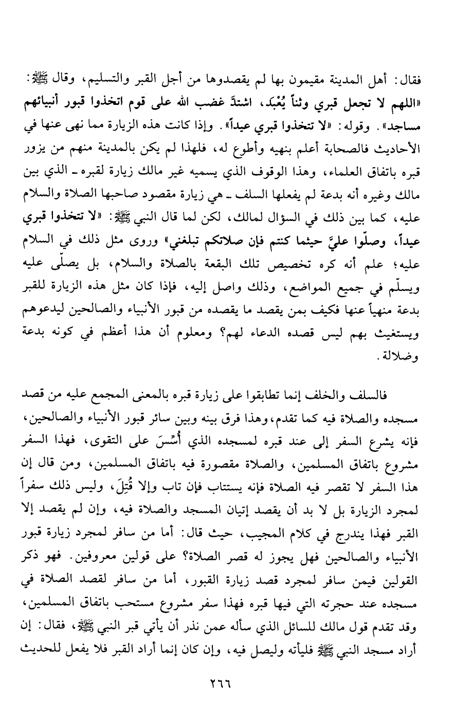 فقال: أهل المدينة مقيمون بها لم يقصدوها من أجل القبر والتسليم، وقال صلى الله عليه وسلم: "اللهم لا تجعل قبري وثناً يُعْبَد، اشتدَّ غضب الله على قوم اتخذوا قبور أنبيائهم مساجد". وقوله: "لا تتخذوا قبري عيداً". وإذا كانت هذه الزيارة مما نهى عنها في الأحاديث فالصحابة أعلم بنهيه وأطوع له، فلهذا لم يكن بالمدينة منهم من يزور قبره باتفاق العلماء، وهذا الوقوف الذي يسميه غير مالك زيارة لقبره- الذي بين مالك وغيره أنه بدعة لم يفعلها السلف- هي زيارة مقصود صاحبها الصلاة والسلام عليه، كما بين ذلك في السؤال لمالك، لكن لما قال النبي صلى الله عليه وسلم: "لا تتخذوا قبري عيداً، وصلّوا عليَّ حيثما كنتم فإن صلاتكم تبلغني" وروى مثل ذلك في السلام عليه؛ علم أنه كره تخصيص تلك البقعة بالصلاة والسلام، بل يصلّى عليه ويسلّم في جميع المواضع، وذلك واصل إليه، فإذا كان مثل هذه الزيارة للقبر بدعة منهياً عنها فكيف بمن يقصد ما يقصده من قبور الأنبياء والصالحين ليدعوهم ويستغيث بهم ليس قصده الدعاء لهم؟ ومعلوم أن هذا أعظم في كونه بدعة وضلالة.