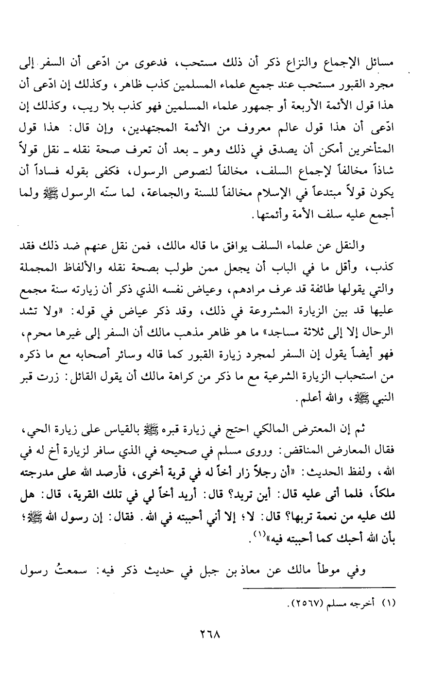 والنقل عن علماء السلف يوافق ما قاله مالك، فمن نقل عنهم ضد ذلك فقد كذب، وأقل ما في الباب أن يجعل ممن طولب بصحة نقله والألفاظ المجملة والتي يقولها طائفة قد عرف مرادهم، وعياض نفسه الذي ذكر أن زيارته سنة مجمع عليها قد بين الزيارة المشروعة في ذلك، وقد ذكر عياض في قوله: "ولا تشد الرحال إلا إلى ثلاثة مساجد" ما هو ظاهر مذهب مالك أن السفر إلى غيرها محرم، فهو أيضاً يقول إن السفر لمجرد زيارة القبور كما قاله وسائر أصحابه مع ما ذكره من استحباب الزيارة الشرعية مع ما ذكر من كراهة مالك أن يقول القائل: زرت قبر النبي صلى الله عليه وسلم، والله أعلم.