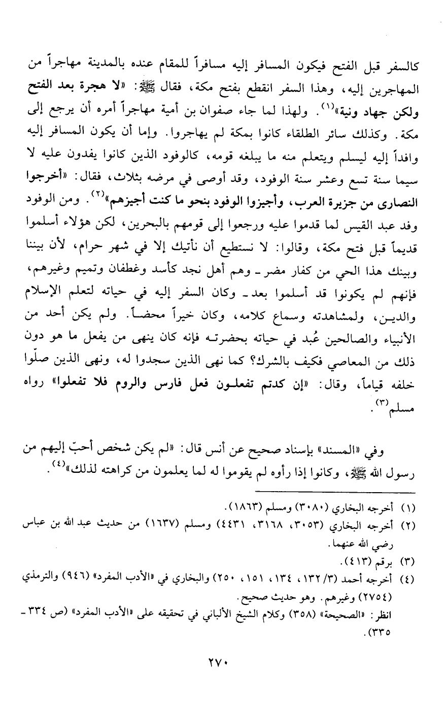 كالسفر قبل الفتح فيكون المسافر إليه مسافراً للمقام عنده بالمدينة مهاجراً من المهاجرين إليه، وهذا السفر انقطع بفتح مكة، فقال صلى الله عليه وسلم: "لا هجرة بعد الفتح ولكن جهاد ونية" 1. ولهذا لما جاء صفوان بن أمية مهاجراً أمره أن يرجع إلى مكة. وكذلك سائر الطلقاء كانوا بمكة لم يهاجروا. وإما أن يكون المسافر إليه وافداً إليه ليسلم ويتعلم منه ما يبلغه قومه، كالوفود الذين كانوا يفدون عليه لاسيما سنة تسع وعشر سنة الوفود، وقد أوصى في مرضه بثلاث، فقال: "أخرجوا النصارى من جزيرة العرب، وأجيزوا الوفود بنحو ما كنت أجيزهم"2. ومن الوفود وفد عبد القيس لما قدموا عليه ورجعوا إلى قومهم بالبحرين، لكن هؤلاء أسلموا قديماً قبل فتح مكة، وقالوا: لا نستطيع أن نأتيك إلا في شهر حرام، لأن بيننا وبينك هذا الحي من كفار مضر -وهم أهل نجد كأسد وغطفان وتميم وغيرهم، فإنهم لم يكونوا قد أسلموا بعد- وكان السفر إليه في حياته لتعلم الإسلام والدين، ولمشاهدته وسماع كلامه، وكان خيراً محضاً. ولم يكن أحد من الأنبياء والصالحين عُبد في حياته بحضرته فإنه كان ينهى من يفعل ما هو دون ذلك من المعاصي فكيف بالشرك؟ كما نهى الذين سجدوا له، ونهى الذين صلّوا خلفه قياماً، وقال: "إن كدتم تفعلون فعل فارس والروم فلا تفعلوا" رواه مسلم3.
