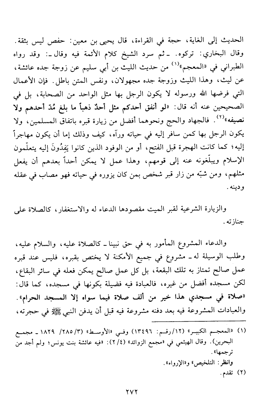 الحديث إلى الغاية، حجة في القراءة، قال يحيى بن معين: حفص ليس بثقة. وقال البخاري: تركوه.- ثم سرد الشيخ كلام الأئمة فيه وقال-: وقد رواه الطبراني في "المعجم"1 من حديث الليث بن أبي سليم عن زوجة جده عائشة، عن ليث، وهذا الليث وزوجة جده مجهولان، ونفس المتن باطل. فإن الأعمال التي فرضها الله ورسوله لا يكون الرجل بها مثل الواحد من الصحابة، بل في الصحيحين عنه أنه قال: "لو أنفق أحدكم مثل أحدٌ ذهباً ما بلغ مُدّ أحدهم ولا نصيفه"2. فالجهاد والحج ونحوهما أفضل من زيارة قبره باتفاق المسلمين، ولا يكون الرجل بها كمن سافر إليه في حياته ورآه، كيف وذلك إما أن يكون مهاجراً إليه؛ كما كانت الهجرة قبل الفتح، أو من الوفود الذين كانوا يَفِدُونَ إليه يتعلّمون الإسلام ويبلّغونه عنه إلى قومهم، وهذا عمل لا يمكن أحداً بعدهم أن يفعل مثلهم، ومن شبّه من زار قبر شخص بمن كان يزوره في حياته فهو مصاب في عقله ودينه.