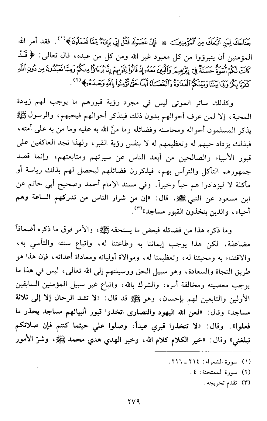 وكذلك سائر الموتى ليس في مجرد رؤية قبورهم ما يوجب لهم زيادة المحبة، إلا لمن عرف أحوالهم بدون ذلك فيتذكر أحوالهم فيحبهم، والرسول صلى الله عليه وسلم يذكر المسلمون أحواله ومحاسنه وفضائله وما من الله به عليه وما من به على أمته، فبذلك يزداد حبهم له وتعظيمهم له لا بنفس رؤية القبر، ولهذا تجد العاكفين على قبور الأنبياء والصالحين من أبعد الناس عن سيرتهم ومتابعتهم، وإنما قصد جمهورهم التأكل والترأس بهم، فيذكرون فضائلهم ليحصل لهم بذلك رياسة أو مأكلة لا ليزدادوا هم حباً وخيراً. وفي مسند الإمام أحمد وصحيح أبي حاتم عن ابن مسعود عن النبي صلى الله عليه وسلم، قال: "إن من شرار الناس من تدركهم الساعة وهم أحياء، والذين يتخذون القبور مساجد"3.