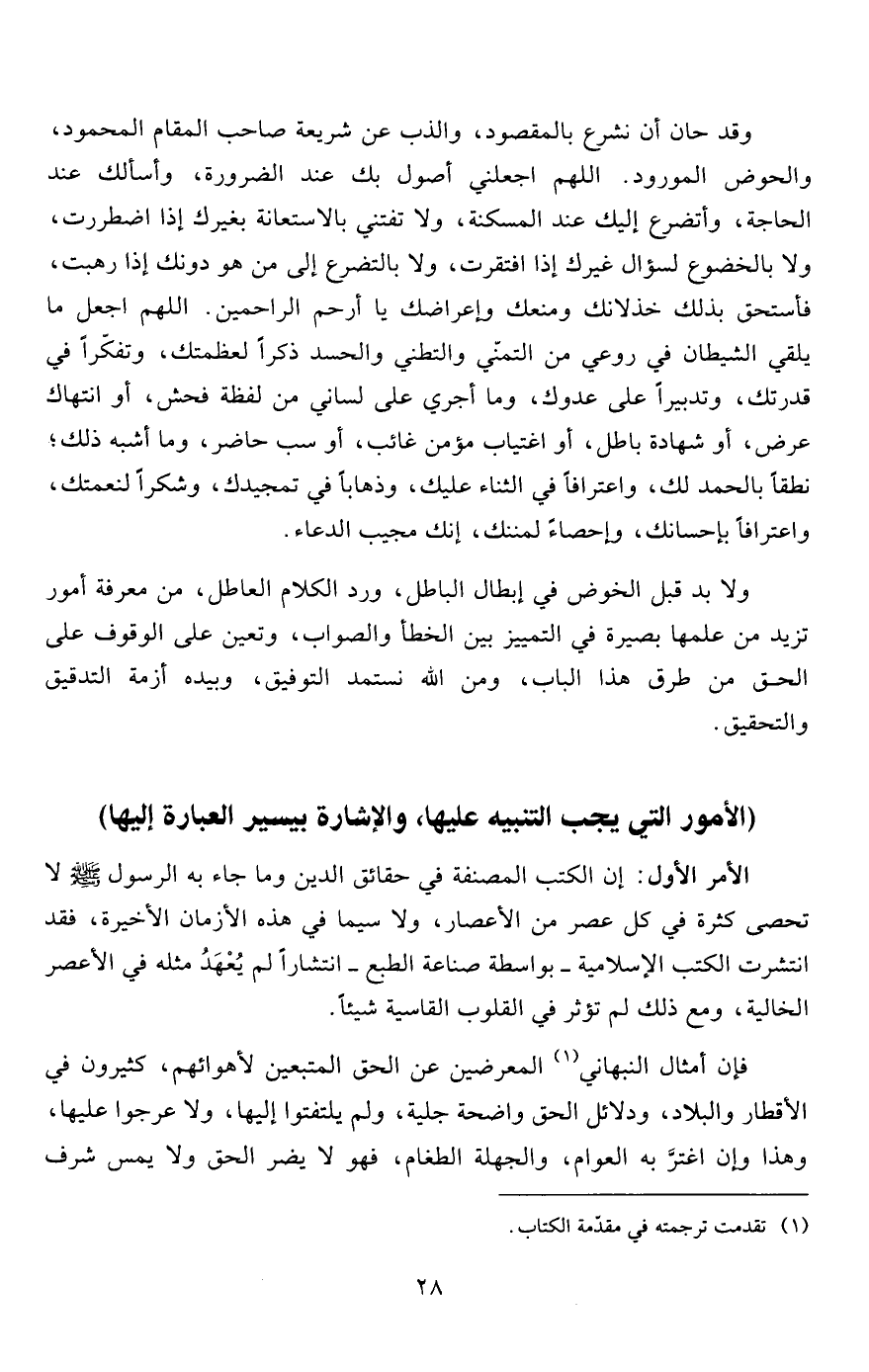 وقد حان أن نشرع بالمقصود، والذب عن شريعة صاحب المقام المحمود، والحوض المورود. اللهم اجعلني أصول بك عند الضرورة، وأسألك عند الحاجة، وأتضرع إليك عند المسكنة، ولا تفتني بالاستعانة بغيرك إذا اضطررت، ولا بالخضوع لسؤال غيرك إذا افتقرت، ولا بالتضرع إلى من هو دونك إذا رهبت، فأستحق بذلك خذلانك ومنعك وإعراضك يا أرحم الراحمين. اللهم اجعل ما يلقي الشيطان في روعي من التمنّي والتطني والحسد ذكراً لعظمتك، وتفكّراً في قدرتك، وتدبيراً على عدوك، وما أجري على لساني من لفظة فحش، أو انتهاك عرض، أو شهادة باطل، أو اغتياب مؤمن غائب، أو سب حاضر، وما أشبه ذلك؛ نطقاً بالحمد لك، واعترافاً في الثناء عليك، وذهاباً في تمجيدك، وشكراً لنعمتك، واعترافاً بإحسانك، وإحصاءً لمننك، إنك مجيب الدعاء.