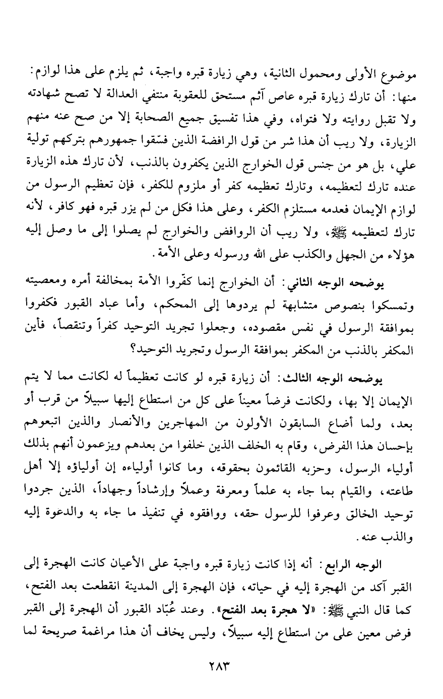 يوضحه الوجه الثالث: أن زيارة قبره لو كانت تعظيماً له لكانت مما لا يتم الإيمان إلا بها، ولكانت فرضاً معيناً على كل من استطاع إليها سبيلاً من قرب أو بعد، ولما أضاع السابقون الأولون من المهاجرين والأنصار والذين اتبعوهم بإحسان هذا الفرض، وقام به الخلف الذين خلفوا من بعدهم ويزعمون أنهم بذلك أولياء الرسول، وحزبه القائمون بحقوقه، وما كانوا أولياءه إن أولياؤه إلا أهل طاعته، والقيام بما جاء به علماً ومعرفة وعملاً وإرشاداً وجهاداً، الذين جردوا توحيد الخالق وعرفوا للرسول حقه، ووافقوه في تنفيذ ما جاء به والدعوة إليه والذب عنه.