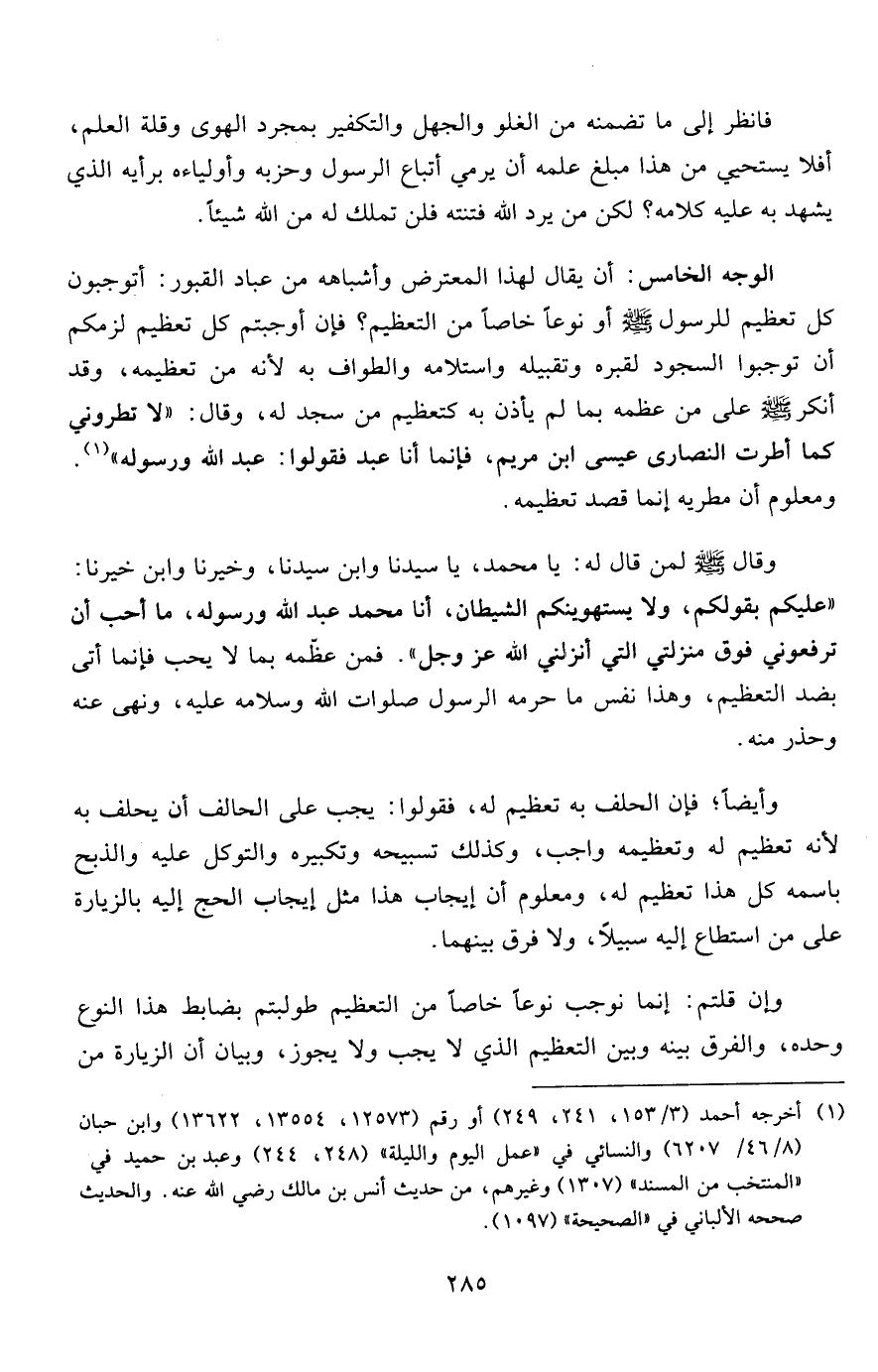 الوجه الخامس: أن يقال لهذا المعترض وأشباهه من عباد القبور: أتوجبون كل تعظيم للرسول صلى الله عليه وسلم أو نوعاً خاصاً من التعظيم؟ فإن أوجبتم كل تعظيم لزمكم أن توجبوا السجود لقبره وتقبيله واستلامه والطواف به لأنه من تعظيمه، وقد أنكر صلى الله عليه وسلم على من عظمه بما لم يأذن به كتعظيم من سجد له، وقال: "لا تطروني كما أطرت النصارى عيسى ابن مريم، فإنما أنا عبد فقولوا: عبد الله ورسوله"1. ومعلوم أن مطريه إنما قصد تعظيمه.