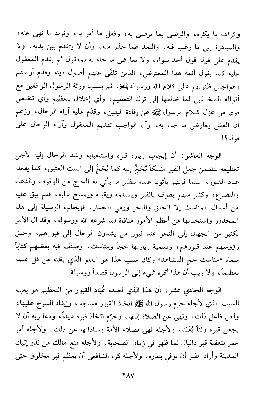الوجه العاشر: أن إيجاب زيارة قبره واستحبابه وشد الرحال إليه لأجل تعظيمه يتضمن جعل القبر منسكاً يُحَجُّ إليه كما يُحَجُّ إلى البيت العتيق، كما يفعله عباد القبور، سيما فإنهم يأتون عنده بنظير ما يأتي به الحاج من الوقوف والدعاء والتضرع، وكثير منهم يطوف بالقبر ويستلمه ويقبله ويمسح عليه، فلم يبق عليه من أعمال المناسك إلا الحلق والنحر ورمي الجمار، فإيجاب الوسيلة إلى هذا المحذور واستحبابها من أعظم الأمور منافاة لما شرعه الله ورسوله، وقد آل الأمر بكثير من الجهال إلى النحر عند قبور من يشدون الرحال إلى قبورهم، وحلق رؤوسهم عند قبورهم، وتسمية زيارتها حجاً ومناسك، وصنف فيه بعضهم كتاباً سماه "مناسك حج المشاهد" وكان سبب هذا هو الغلو الذي يظنه من قل علمه تعظيماً، ولا ريب أن هذا أكره شيء إلى الرسول قصداً ووسيلة.