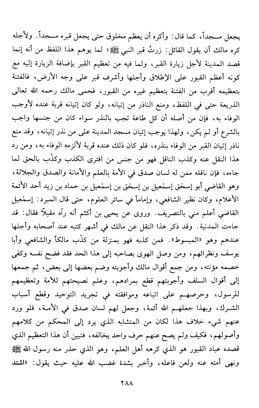 يجعل مسجداً، كما قال: وأكره أن يعظم مخلوق حتى يجعل قبره مسجداً. ولأجله كره مالك أن يقول القائل: زرتُ قبر النبي صلى الله عليه وسلم؛ لما يوهم هذا اللفظ من أنه إنما قصد المدينة لأجل زيارة القبر، ولما فيه من تعظيم القبر بإضافة الزيارة إليه مع كونه أعظم القبور على الإطلاق وأجلها وأشرف قبر على وجه الأرض، فالفتنة بتعظيمه أقرب من الفتنة بتعظيم غيره من القبور، فحمى مالك رحمه الله تعالى الذريعة حتى في اللفظ، ومنع الناذر من إتيانه، ولو كان إتيانه قربة عنده لأوجب الوفاء به، فإن من أصله أن كل طاعة تجب بالنذر سواء كان من جنسها واجب بالشرع أو لم يكن، ولهذا يوجب إتيان مسجد المدينة على من نذر إتيانه، وقد منع ناذر إتيان القبر من الوفاء بنذره، فلو كان ذلك عنده قربة لألزمه الوفاء به، ومن رد هذا النقل عنه وكذّب الناقل فهو من جنس من افترى الكذب وكذّب بالحق لما جاءه، فإن ناقله ممن له لسان صدق في الأمة بالعلم والأمانة والصدق والجلالة، وهو القاضي أبو إسحاق إسماعيل بن إسحاق بن إسماعيل بن حماد بن زيد أحد الأئمة الأعلام، وكان نظير الشافعي، وإماماً في سائر العلوم، حتى قال المبرد: إسماعيل القاضي أعلم مني بالتصريف. وروى عن يحيى بن أكثم أنه رآه مقبلاً فقال: قد جاءت المدنية. وقد ذكر هذا النقل عن مالك في أشهر كتبه عند أصحابه وأجلها عندهم وهو "المبسوط". فمن كذبه فهو بمنزلة من كذّب مالكاً والشافعي وأبا يوسف ونظرائهم، ومن وصل الهوى بصاحبه إلى هذا الحد فقد فضح نفسه وكفى خصمه مؤنته، ومن جمع أقوال مالك وأجوبته وضم بعضها إلى بعض، ثم جمعها إلى أقوال السلف وأجوبتهم قطع بمرادهم، وعلم نصيحتهم للأمة وتعظيمهم للرسول، وحرصهم على اتباعه وموافقته في تجريد التوحيد وقطع أسباب الشرك، وبهذا جعلهم الله أئمة، وجعل لهم لسان صدق في الأمة، فلو ورد عنهم شيء خلاف هذا لكان من المتشابه الذي يرد إلى المحكم من كلامهم وأصولهم، فكيف ولم يصح عنهم حرف واحد يخالفه، فتبين أن هذا التعظيم الذي قصده عباد القبور هو الذي كرهه أهل العلم، وهو الذي حذر منه رسول الله صلى الله عليه وسلم ونهى أمته عنه ولعن فاعله، وأخبر بشدة غضب الله عليه حيث يقول: "اشتد
