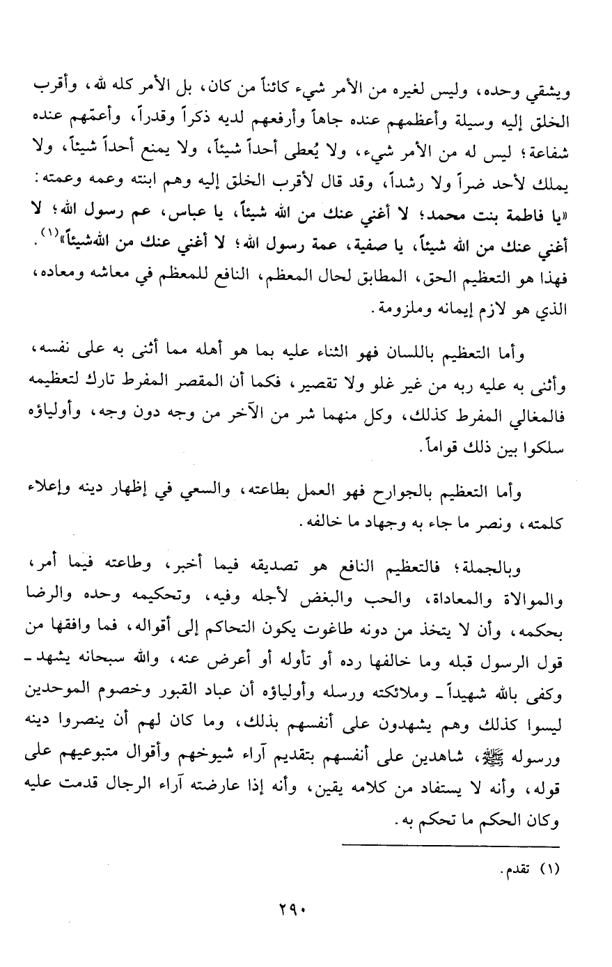 ويشقي وحده، وليس لغيره من الأمر شيء كائناً من كان، بل الأمر كله لله، وأقرب الخلق إليه وسيلة وأعظمهم عنده جاهاً وأرفعهم لديه ذكراً وقدراً، وأعمّهم عنده شفاعة؛ ليس له من الأمر شيء، ولا يعطى أحداً شيئاً، ولا يمنع أحداً شيئاً، ولا يملك لأحد ضراً ولا رشداً، وقد قال لأقرب الخلق إليه وهم ابنته وعمه وعمته: "يا فاطمة بنت محمد؛ لا أغني عنك من الله شيئاً، يا عباس، عم رسول الله؛ لا أغني عنك من الله شيئاً، يا صفية، عمة رسول الله؛ لا أغني عنك من الله شيئاً"1. فهذا هو التعظيم الحق، المطابق لحال المعظم، النافع للمعظم في معاشه ومعاده، الذي هو لازم إيمانه وملزومة.