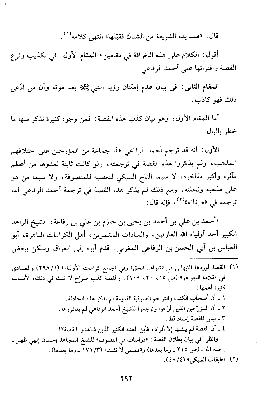 الأول: أنه قد ترجم أحمد الرفاعي هذا جماعة من المؤرخين على اختلافهم المذهب، ولم يذكروا هذه القصة في ترجمته، ولو كانت ثابتة لعدّوها من أعظم مآثره وأكبر مفاخره، لاسيما التاج السبكي لتعصبه للمتصوفة، ولاسيما من هو على مذهبه ونحلته، ومع ذلك لم يذكر هذه القصة في ترجمة أحمد الرفاعي لما ترجمه في "طبقاته"2، فإنه قال:
