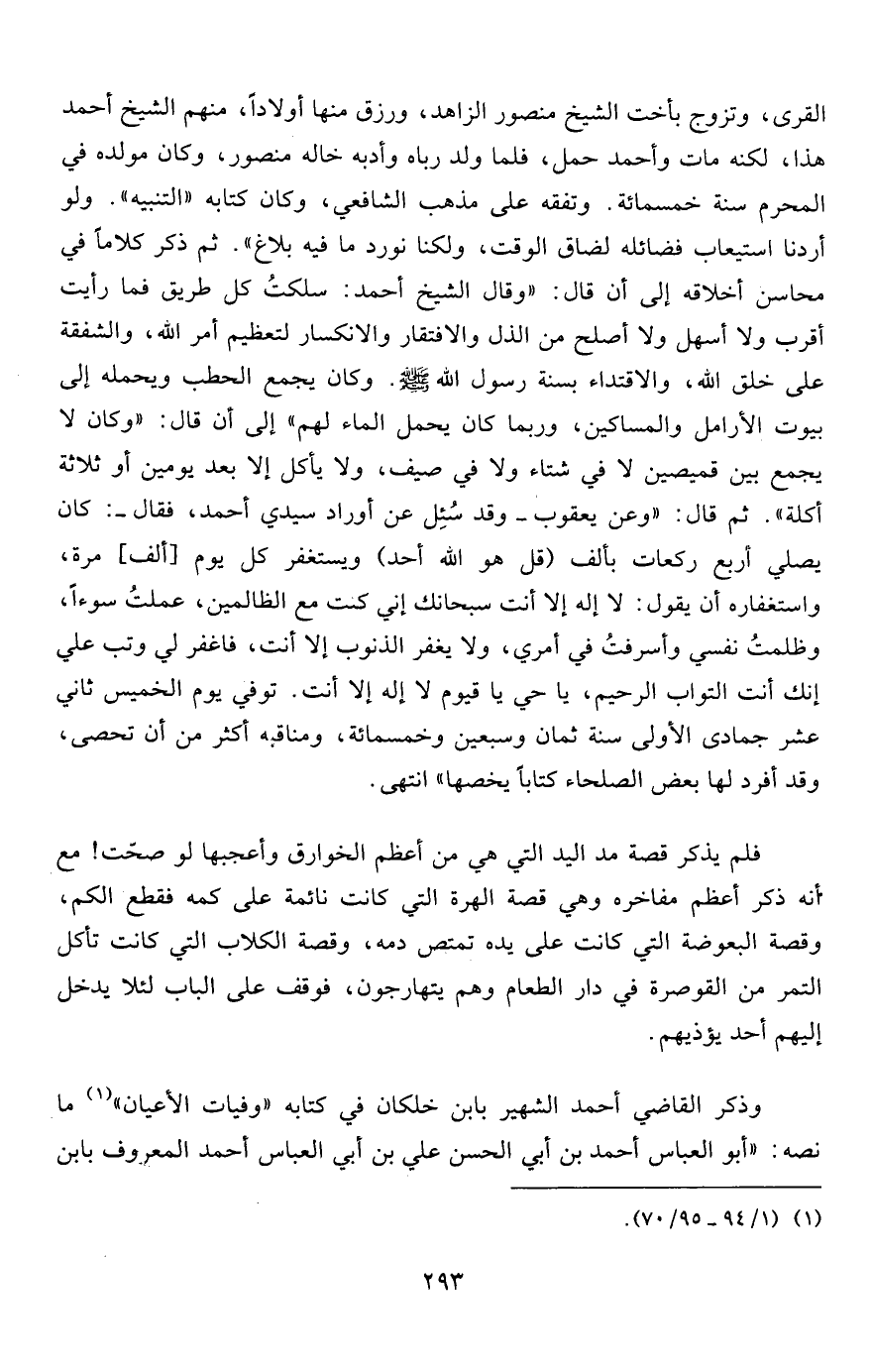 القرى، وتزوج بأخت الشيخ منصور الزاهد، ورزق منها أولاداً، منهم الشيخ أحمد هذا، لكنه مات وأحمد حمل، فلما ولد رباه وأدبه خاله منصور، وكان مولده في المحرم سنة خمسمائة. وتفقه على مذهب الشافعي، وكان كتابه "التنبيه". ولو أردنا استيعاب فضائله لضاق الوقت، ولكنا نورد ما فيه بلاغ ". ثم ذكر كلاماً في محاسن أخلاقه إلى أن قال: "وقال الشيخ أحمد: سلكتُ كل طريق فما رأيت أقرب ولا أسهل ولا أصلح من الذل والافتقار والانكسار لتعظيم أمر الله، والشفقة على خلق الله، والإقتداء بسنة رسول الله صلى الله عليه وسلم. وكان يجمع الحطب ويحمله إلى بيوت الأرامل والمساكين، وربما كان يحمل الماء لهم "إلى أن قال: "وكان لا يجمع بين قميصين لا في شتاء ولا في صيف، ولا يأكل إلا بعد يومين أو ثلاثة أكلة". ثم قال: "وعن يعقوب- وقد سُئل عن أوراد سيدي أحمد، فقال-: كان يصلي أربع ركعات بألف (قل هو الله أحد) ويستغفر كل يوم [ألف] مرة، واستغفاره أن يقول: لا إله إلا أنت سبحانك إني كنت مع الظالمين، عملتُ سوءاً، وظلمتُ نفسي وأسرفتُ في أمري، ولا يغفر الذنوب إلا أنت، فاغفر لى وتب علي إنك أنت التواب الرحيم، يا حي يا قيوم لا إله إلا أنت. توفي يوم الخميس ثاني عشر جمادى الأولى سنة ثمان وسبعين وخمسمائة، ومناقبه أكثر من أن تحصى، وقد أفرد لها بعض الصلحاء كتاباً يخصها" انتهى.