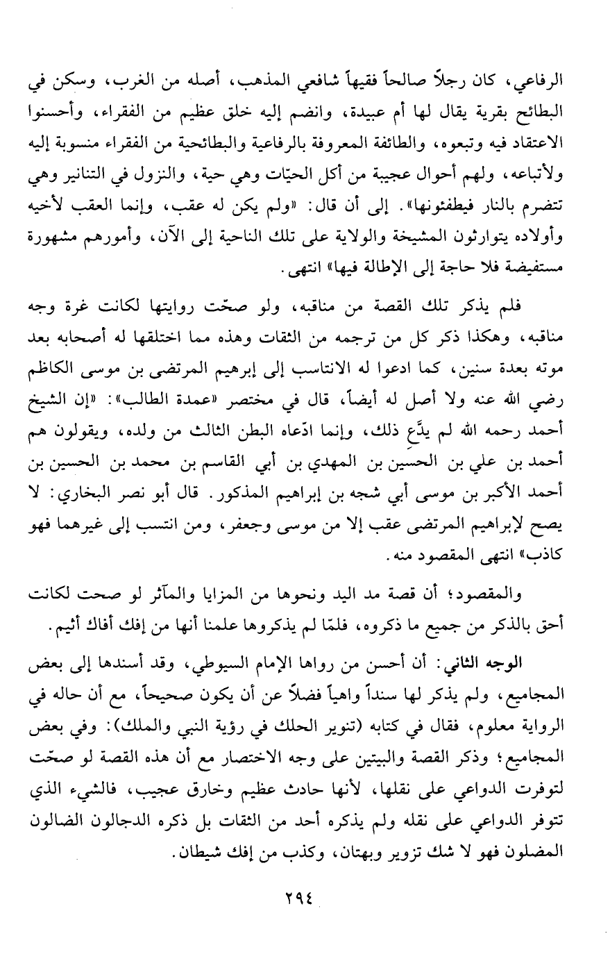فلم يذكر تلك القصة من مناقبه، ولو صحّت روايتها لكانت غرة وجه مناقبه، وهكذا ذكر كل من ترجمه من الثقات وهذه مما اختلقها له أصحابه بعد موته بعدة سنين، كما ادعوا له الانتساب إلى إبراهيم المرتضى بن موسى الكاظم رضي الله عنه ولا أصل له أيضاً، قال في مختصر "عمدة الطالب": "إن الشيخ أحمد رحمه الله لم يدَّعِ ذلك، وإنما ادّعاه البطن الثالث من ولده، ويقولون هم أحمد بن علي بن الحسين بن المهدي بن أبي القاسم بن محمد بن الحسين بن أحمد الأكبر بن موسى أبي شجه بن إبراهيم المذكور. قال أبو نصر البخاري: لا يصح لإبراهيم المرتضى عقب إلا من موسى وجعفر، ومن انتسب إلى غيرهما فهو كاذب" انتهى المقصود منه.