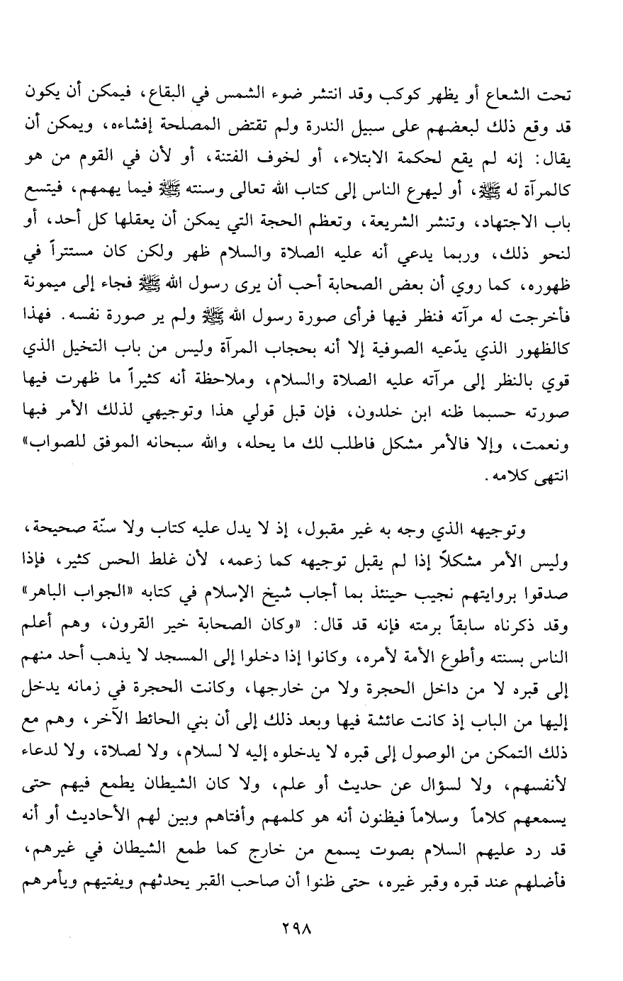 وتوجيهه الذي وجه به غير مقبول، إذ لا يدل عليه كتاب ولا سنّة صحيحة، وليس الأمر مشكلاً إذا لم يقبل توجيهه كما زعمه، لأن غلط الحس كثير، فإذا صدقوا بروايتهم نجيب حينئذ بما أجاب شيخ الإسلام في كتابة "الجواب الباهر" وقد ذكرناه سابقاً برمته فإنه قد قال: "وكان الصحابة خير القرون، وهم أعلم الناس بسنته وأطوع الأمة لأمره، وكانوا إذا دخلوا إلى المسجد لا يذهب أحد منهم إلى قبره لا من داخل الحجرة ولا من خارجها، وكانت الحجرة في زمانه يدخل إليها من الباب إذ كانت عائشة فيها وبعد ذلك إلى أن بني الحائط الآخر، وهم مع ذلك التمكن من الوصول إلى قبره لا يدخلوه إليه لا لسلام، ولا لصلاة، ولا لدعاء لأنفسهم، ولا لسؤال عن حديث أو علم، ولا كان الشيطان يطمع فيهم حتى يسمعهم كلاماً وسلاماً فيظنون أنه هو كلمهم وأفتاهم وبين لهم الأحاديث أو أنه قد رد عليهم السلام بصوت يسمع من خارج كما طمع الشيطان في غيرهم، فأضلهم عند قبره وقبر غيره، حتى ظنوا أن صاحب القبر يحدثهم ويفتيهم ويأمرهم