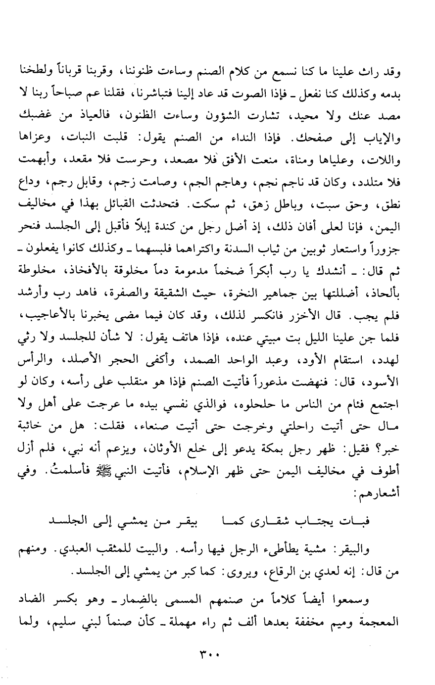 وقد راث علينا ما كنا نسمع من كلام الصنم وساءت ظنوننا، وقربنا قرباناً ولطخنا بدمه وكذلك كنا نفعل -فإذا الصوت قد عاد إلينا فتباشرنا، فقلنا عم صباحاً ربنا لا مصد عنك ولا محيد، تشارت الشؤون وساءت الظنون، فالعياذ من غضبك والإياب إلى صفحك. فإذا النداء من الصنم يقول: قلبت النبات، وعزاها واللات، وعلياها ومناة، منعت الأفق فلا مصعد، وحرست فلا مقعد، وأبهمت فلا متلدد، وكان قد ناجم نجم، وهاجم الجم، وصامت زجم، وقابل رجم، وداع نطق، وحق سبت، وباطل زهق، ثم سكت. فتحدثت القبائل بهذا في مخاليف اليمن، فإنا لعلى أفان ذلك، إذ أضل رجل من كندة إبلاً فأقبل إلى الجلسد فنحر جزوراً واستعار ثوبين من ثياب السدنة واكتراهما فلبسهما- وكذلك كانوا يفعلون- ثم قال:- أنشدك يا رب أبكراً ضخماً مدمومة دماً مخلوقة بالأفخاذ، مخلوطة بألحاذ، أضللتها بين جماهير النخرة، حيث الشقيقة والصفرة، فاهد رب وأرشد فلم يجب. قال الأخزر فانكسر لذلك، وقد كان فيما مضى يخبرنا بالأعاجيب، فلما جن علينا الليل بت مبيتي عنده، فإذا هاتف يقول: لا شأن للجلسد ولا رثي لهدد، استقام الأود، وعبد الواحد الصمد، وأكفى الحجر الأصلد، والرأس الأسود، قال: فنهضت مذعوراً فأتيت الصنم فإذا هو منقلب على رأسه، وكان لو اجتمع فئام من الناس ما حلحلوه، فوالذي نفسي بيده ما عرجت على أهل ولا مال حتى أتيت راحلتي وخرجت حتى أتيت صنعاء، فقلت: هل من خائبة خبر؟ فقيل: ظهر رجل بمكة يدعو إلى خلع الأوثان، ويزعم أنه نبي، فلم أزل أطوف في مخاليف اليمن حتى ظهر الإسلام، فأتيت النبي صلى الله عليه وسلم فأسلمتُ. وفي أشعارهم: