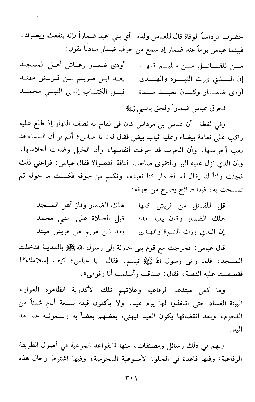 وفي لفظة: أن عباس بن مرداس كان في لقاح له نصف النهار إذ طلع عليه راكب على نعامة بيضاء وعليه ثياب بيض فقال له: يا عباس؛ ألم تر أن السماء قد تعب أحراسها، وأن الحرب قد حرقت أنفاسها، وأن الخيل وضعت أحلاسها، وأن الذي نزل عليه البر والتقوى صاحب الناقة القصوا؟ فقال عباس: فراعني ذلك فجئت وثناً لنا يقال له الضمار كنا نعبده، ونكلم من جوفه فكنست ما حوله ثم تمسحت به، فإذا صائح يصيح من جوفه: