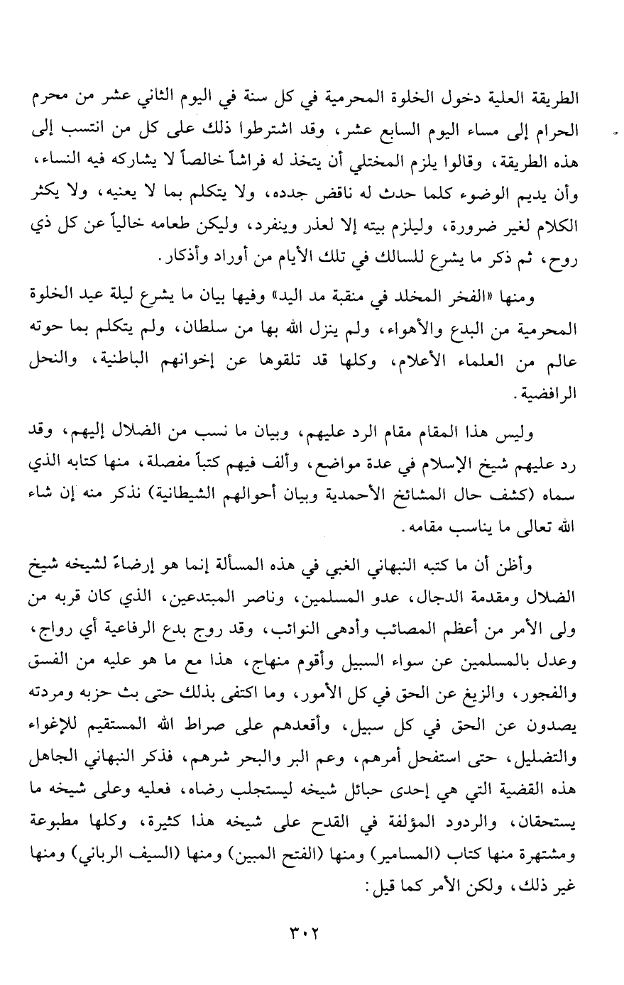 وأظن أن ما كتبه النبهاني الغبي في هذه المسألة إنما هو إرضاءً لشيخه شيخ الضلال ومقدمة الدجال، عدو المسلمين، وناصر المبتدعين، الذي، كان قربه من ولى الأمر من أعظم المصائب وأدهى النوائب، وقد روج بدع الرفاعية أي رواج، وعدل بالمسلمين عن سواء السبيل وأقوم منهاج، هذا مع ما هو عليه من الفسق والفجور، والزيغ عن الحق في كل الأمور، وما اكتفى بذلك حتى بث حزبه ومردته يصدون عن الحق في كل سبيل، وأقعدهم على صراط الله المستقيم للإغواء والتضليل، حتى استفحل أمرهم، وعم البر والبحر شرهم، فذكر النبهاني الجاهل هذه القضية التي هي إحدى حبائل شيخه ليستجلب رضاه، فعليه وعلى شيخه ما يستحقان، والردود المؤلفة في القدح على شيخه هذا كثيرة، وكلها مطبوعة ومشتهرة منها كتاب (المسامير) ومنها (الفتح المبين) ومنها (السيف الرباني) ومنها غير ذلك، ولكن الأمر كما قيل: