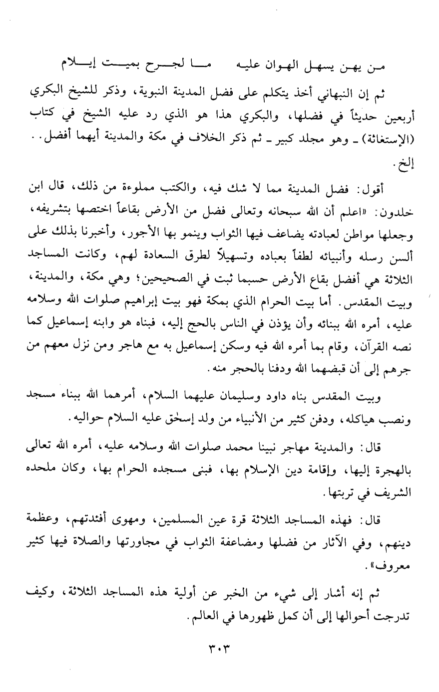 أقول: فضل المدينة مما لا شك فيه، والكتب مملوءة من ذلك، قال ابن خلدون: "اعلم أن الله سبحانه وتعالى فضل من الأرض بقاعاً اختصها بتشريفه، وجعلها مواطن لعبادته يضاعف فيها الثواب وينمو بها الأجور، وأخبرنا بذلك على ألسن رسله وأنبيائه لطفاً بعباده وتسهيلاً لطرق السعادة لهم، وكانت المساجد الثلاثة هي أفضل بقاع الأرض حسبما ثبت في الصحيحين؛ وهي مكة، والمدينة، وبيت المقدس. أما بيت الحرام الذي بمكة فهو بيت إبراهيم صلوات الله وسلامه عليه، أمره الله ببنائه وأن يؤذن في الناس بالحج إليه، فبناه هو وابنه إسماعيل كما نصه القرآن، وقام بما أمره الله فيه وسكن إسماعيل به مع هاجر ومن نزل معهم من جرهم إلى أن قبضهما الله ودفنا بالحجر منه.