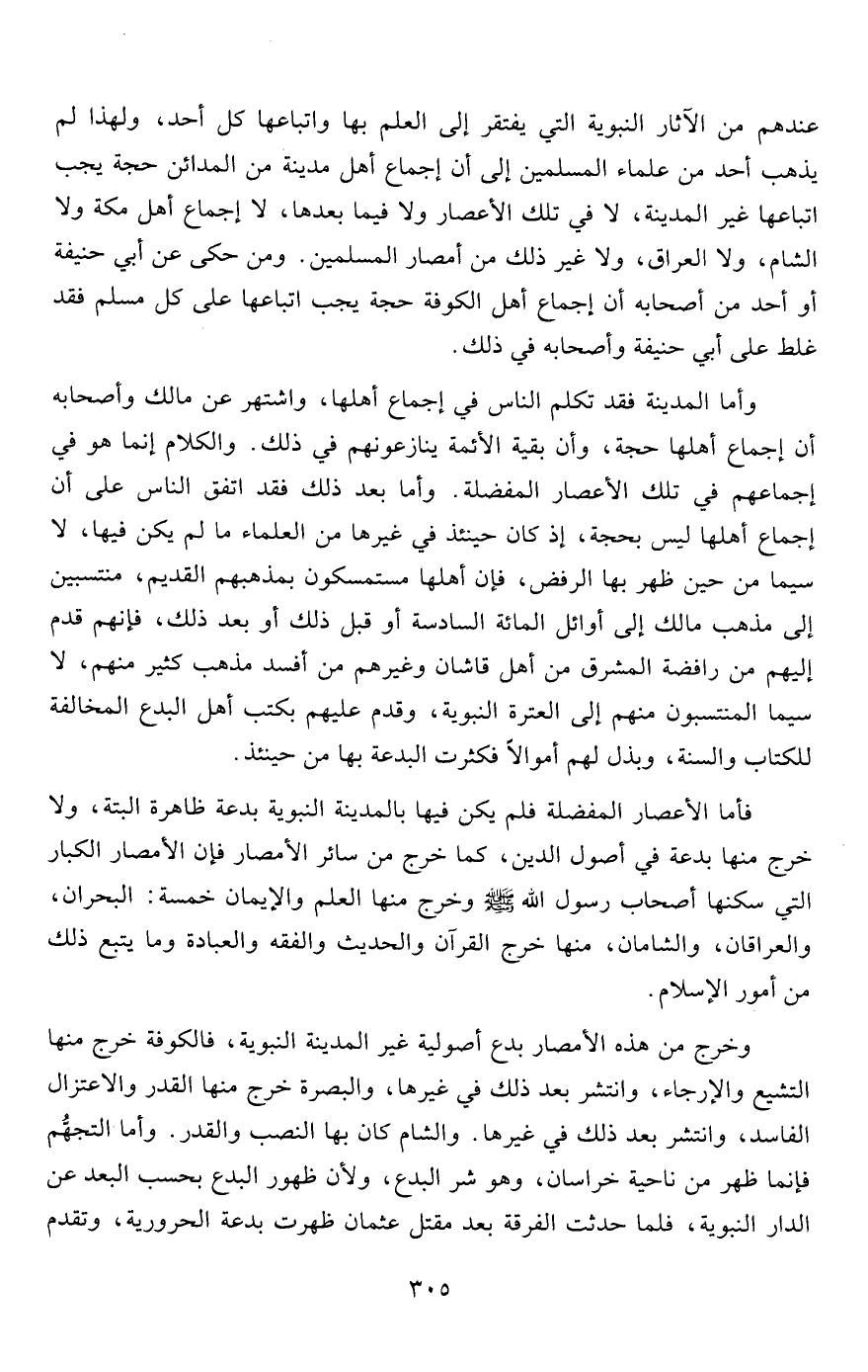 عندهم من الآثار النبوية التي يفتقر إلى العلم بها واتباعها كل أحد، ولهذا لم يذهب أحد من علماء المسلمين إلى أن إجماع أهل مدينة من المدائن حجة يجب اتباعها غير المدينة، لا في تلك الأعصار ولا فيما بعدها، لا إجماع أهل مكة ولا الشام، ولا العراق، ولا غير ذلك من أمصار المسلمين. ومن حكى عن أبي حنيفة أو أحد من أصحابه أن إجماع أهل الكوفة حجة يجب اتباعها على كل مسلم فقد غلط على أبي حنيفة وأصحابه في ذلك.