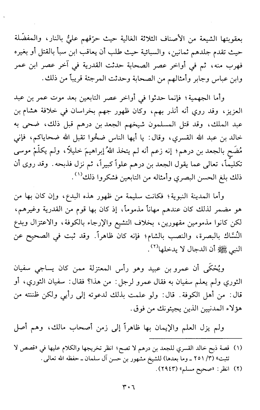 1 قصة ذبح خالد القسري للجعد بن درهم لا تصح؛ انظر تخريجها والكلام عليها في "قصص لا تثبت" (3/251- وما بعدها) للشيخ مشهور بن حسن آل سلمان- حفظه الله تعالى.