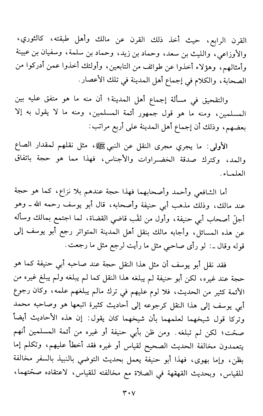 القرن الرابع، حيث أخذ ذلك القرن عن مالك وأهل طبقته، كالثوري، والأوزاعي، والليث بن سعد، وحماد بن زيد، وحماد بن سلمة، وسفيان بن عيينة وأمثالهم، وهؤلاء أخذوا عن طوائف من التابعين، وأولئك أخذوا عمن أدركوا من الصحابة، والكلام في إجماع أهل المدينة في تلك الأعصار.