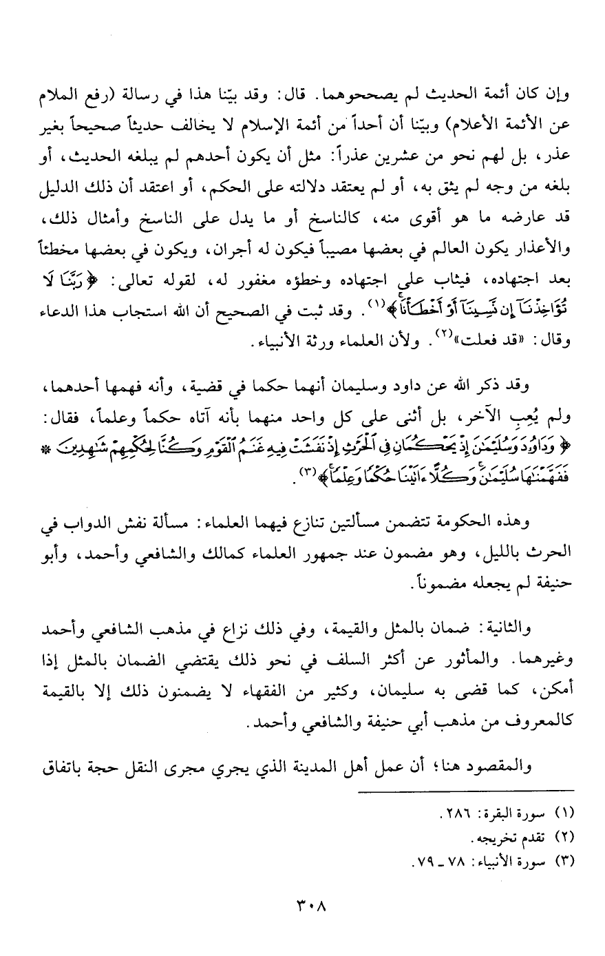 وهذه الحكومة تتضمن مسألتين تنازع فيهما العلماء: مسألة نفش الدواب في الحرث بالليل، وهو مضمون عند جمهور العلماء كمالك والشافعي وأحمد، وأبو حنيفة لم يجعله مضموناً.