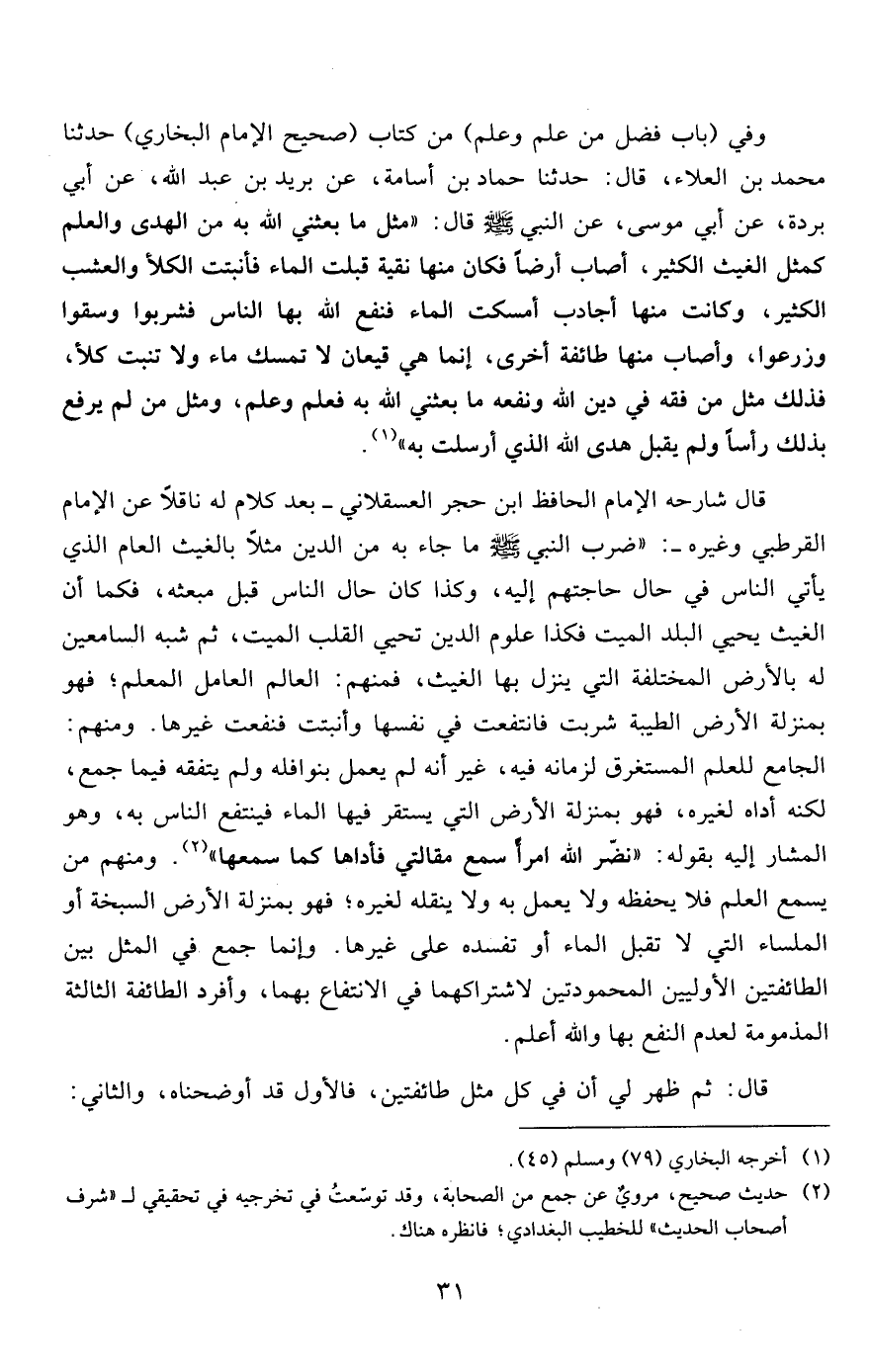 وفي (باب فضل من علم وعلم) من كتاب (صحيح الإمام البخاري) حدثنا محمد بن العلاء، قال: حدثنا حماد بن أسامة، عن بريد بن عبد الله، عن أبي بردة، عن أبي موسى، عن النبي صلى الله عليه وسلم قال: "مثل ما بعثني الله به من الهدى والعلم كمثل الغيث الكثير، أصاب أرضاً فكان منها نقية قبلت الماء فأنبتت الكلأ والعشب الكثير، وكانت منها أجادب أمسكت الماء فنفع الله بها الناس فشربوا وسقوا وزرعوا، وأصاب منها طائفة أخرى، إنما هي قيعان لا تمسك ماء ولا تنبت كلأ، فذلك مثل من فقه في دين الله ونفعه ما بعثني الله به فعلم وعلم، ومثل من لم يرفع بذلك رأساً ولم يقبل هدى الله الذي أرسلت به"1.
